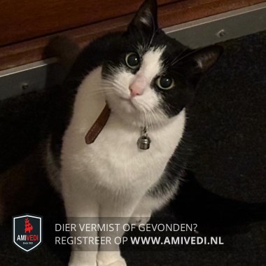| Signalement | Wit/zwarte poes. Zwart op het kopje dat doorloopt over en langs de oogjes, witte neusbrug dat doorloopt naar het voorhoofd, verder wit snuitje, roze neuspunt. Witte brede sjaal om de nek. Witte schouders, borst, buik en pootjes. Zwart dek over de rug dat een beetje doorloopt over de flanken. Hartje op haar linker voorpoot. Bruine halsband met een kokertje. |