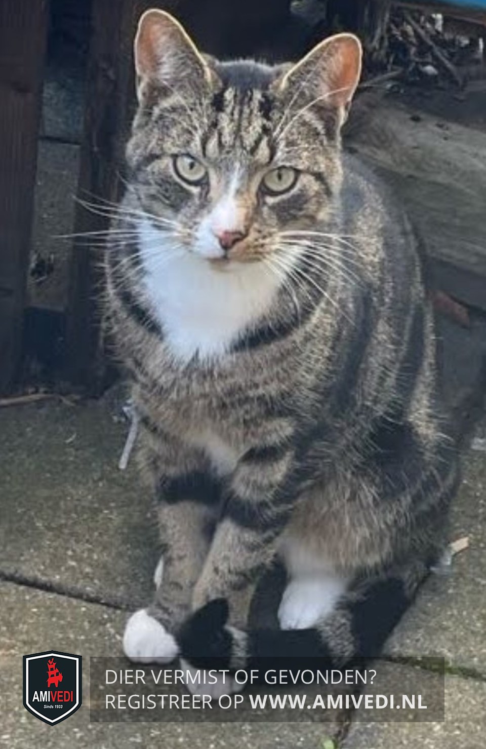| Signalement | Een klein hapje uit zijn oor tegenwoordig. Witte sokjes. Witte vlek op neus. Witte borst |