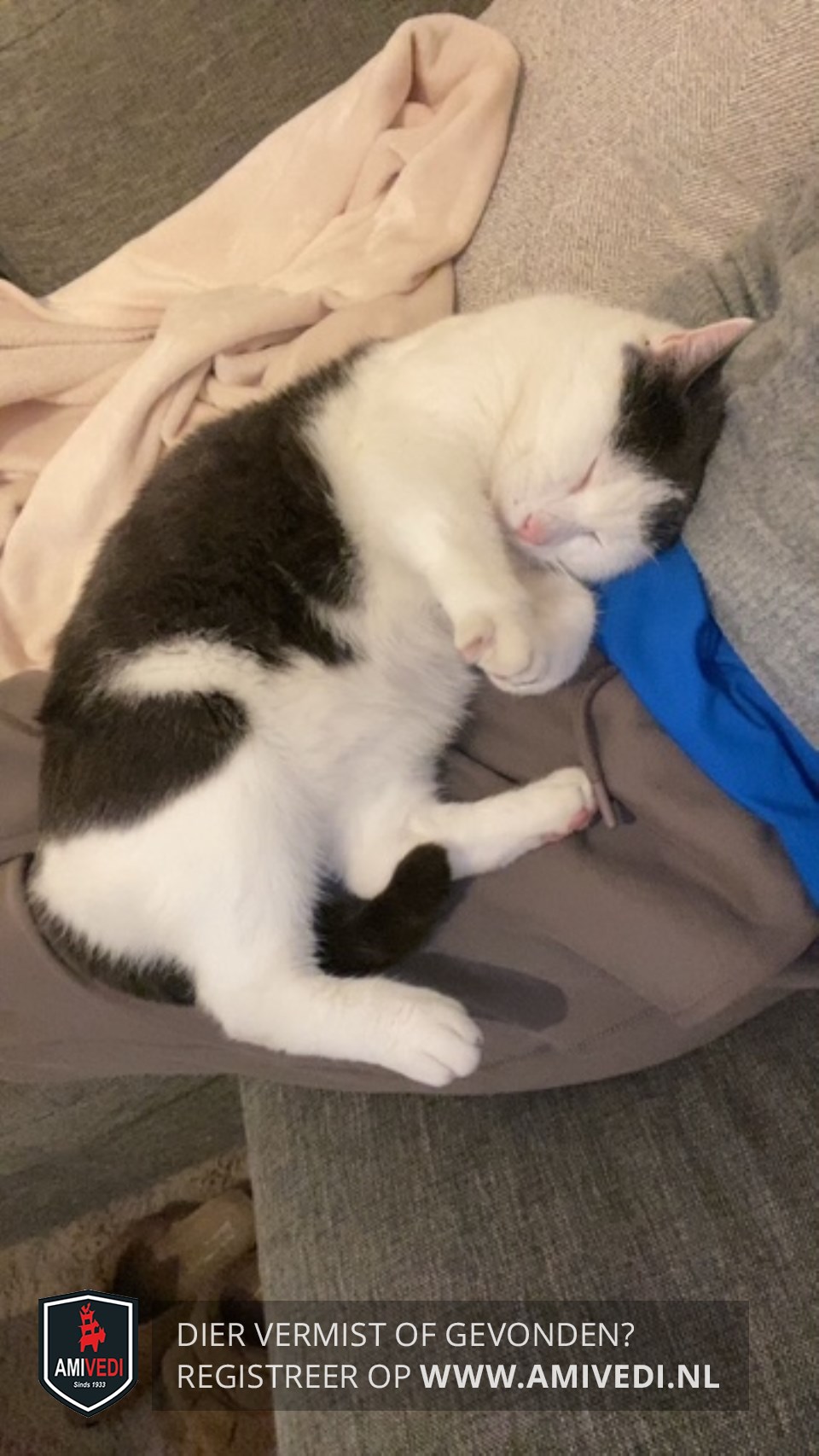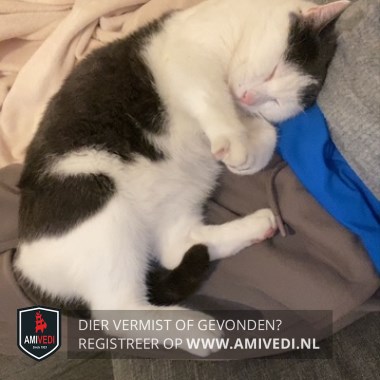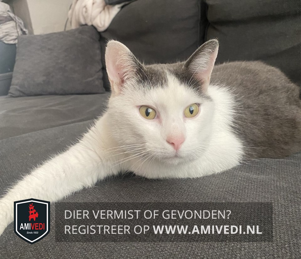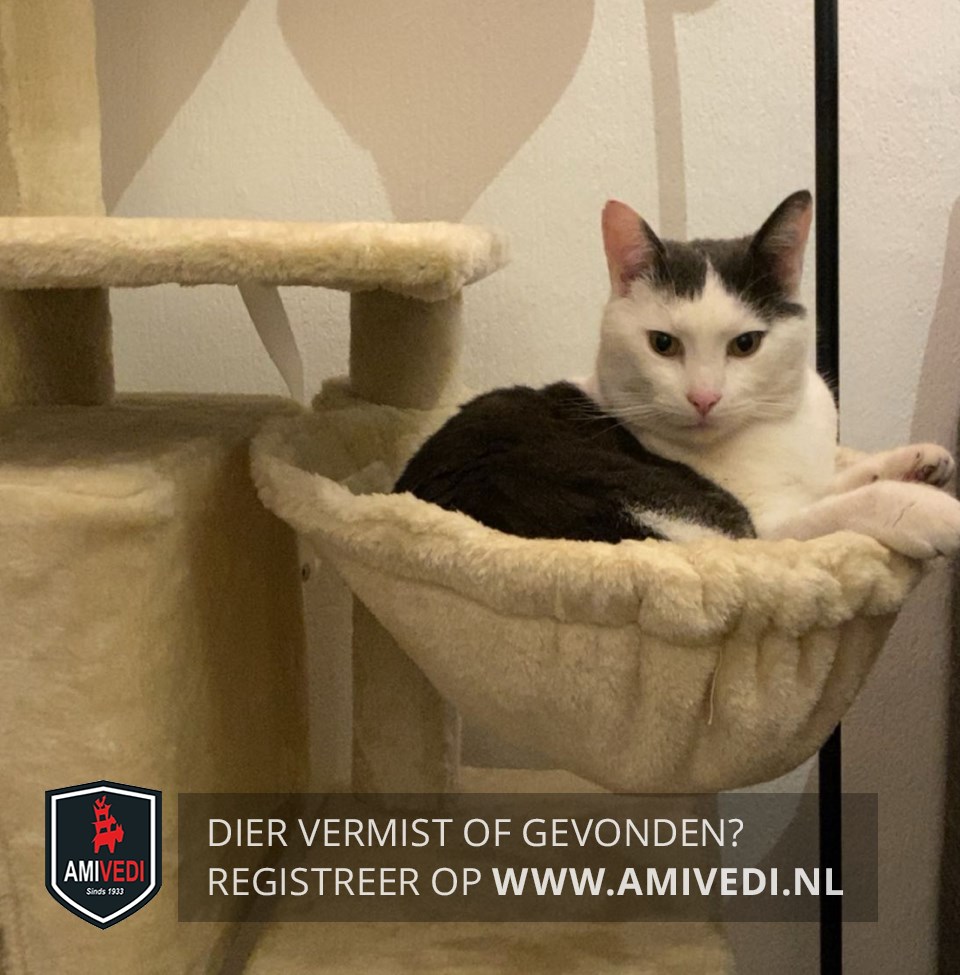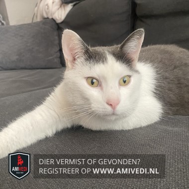 | Signalement | Europese korthaar kater, wit met grijs gevlekt. Bovenop kopje 2 grijze vlekken lang de oren, rug grijs, doorlopend naar zijflanken, zwarte staart. |