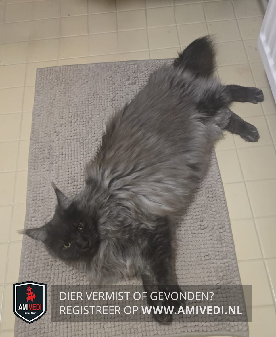 | Signalement | Voornamelijk licht- en donkergrijs gemêleerde langharige Maine Coon kater. Zwart/donkergrijs gezichtje. De pootjes zijn zwart/grijs gemêleerd. Rechter achterpootje grijs met een zwart sokje. Zwarte staart. |