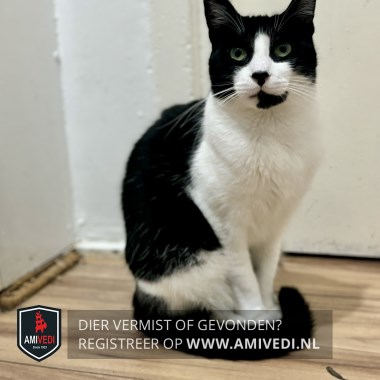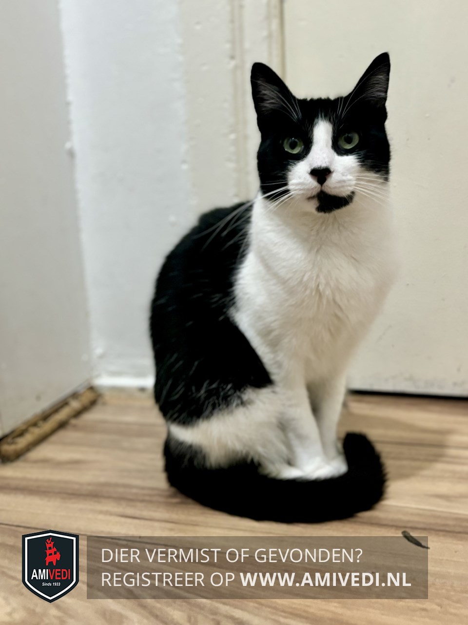 | Signalement | Zwart/witte kater. Zwart op het kopje dat doorloopt t/m en langs de oogjes, witte neusbrug, zwarte neuspunt, zwarte vlek links op de kin. Witte brede sjaal om de nek. Witte borst, buik en pootjes. Zwart dek dover de rug dat een beetje doorloopt over de heup. Witte heup. Zwarte staart. |