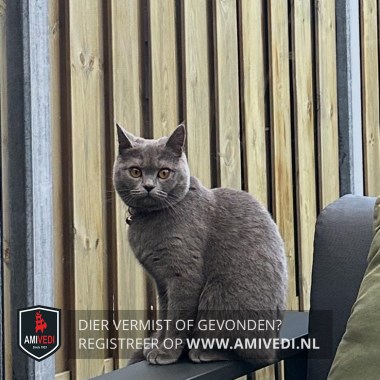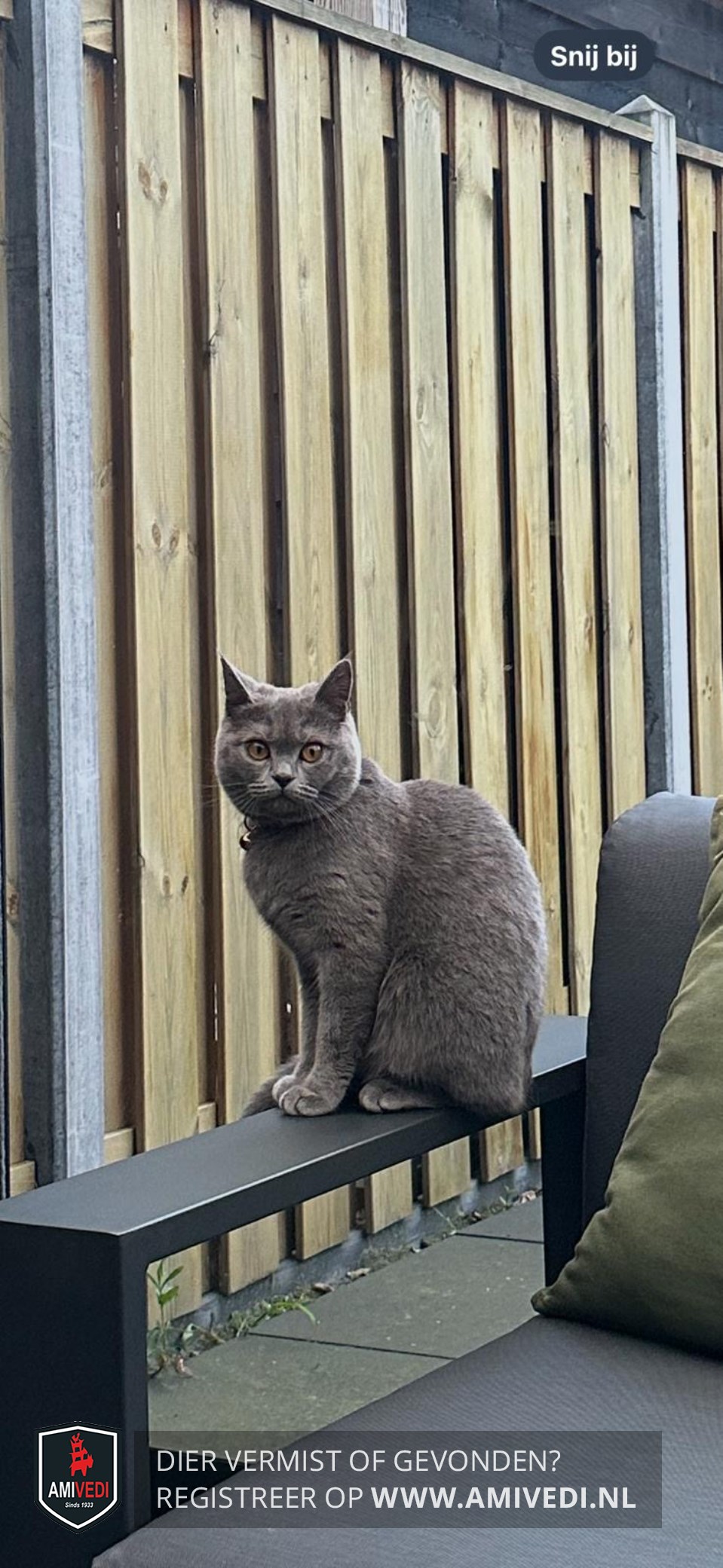| Signalement | Blauwe britse korthaar met beige Halsband met naam en telefoonnummer. |