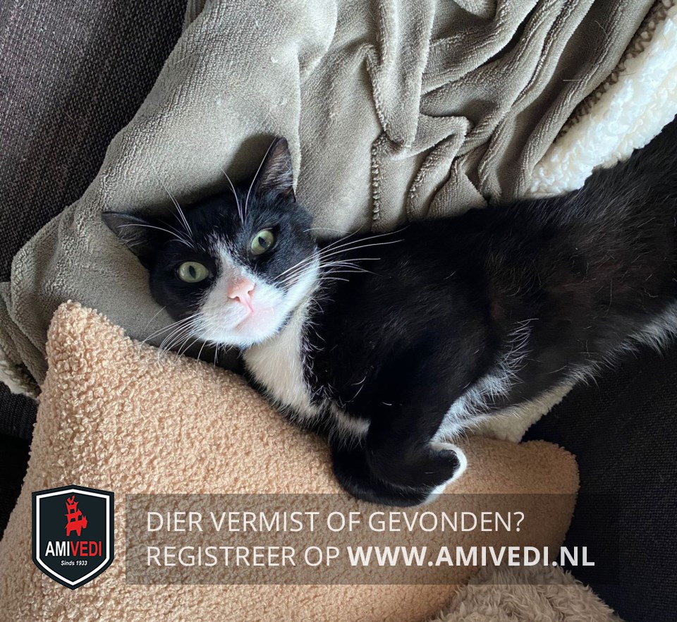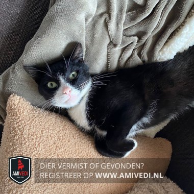| Signalement | Zwart met wit. Snuit wit, loopt in driehoek uit over neusbrug. Lichtroze neus. Witte snorharen, witte oogharen. Groene ogen. Witte keel. Witte bles. Voorpoten witte teentjes. Witte buik. Wit tussen de achterpoten. Achterpoten witte sokken. |