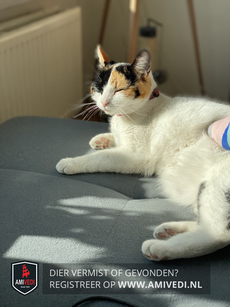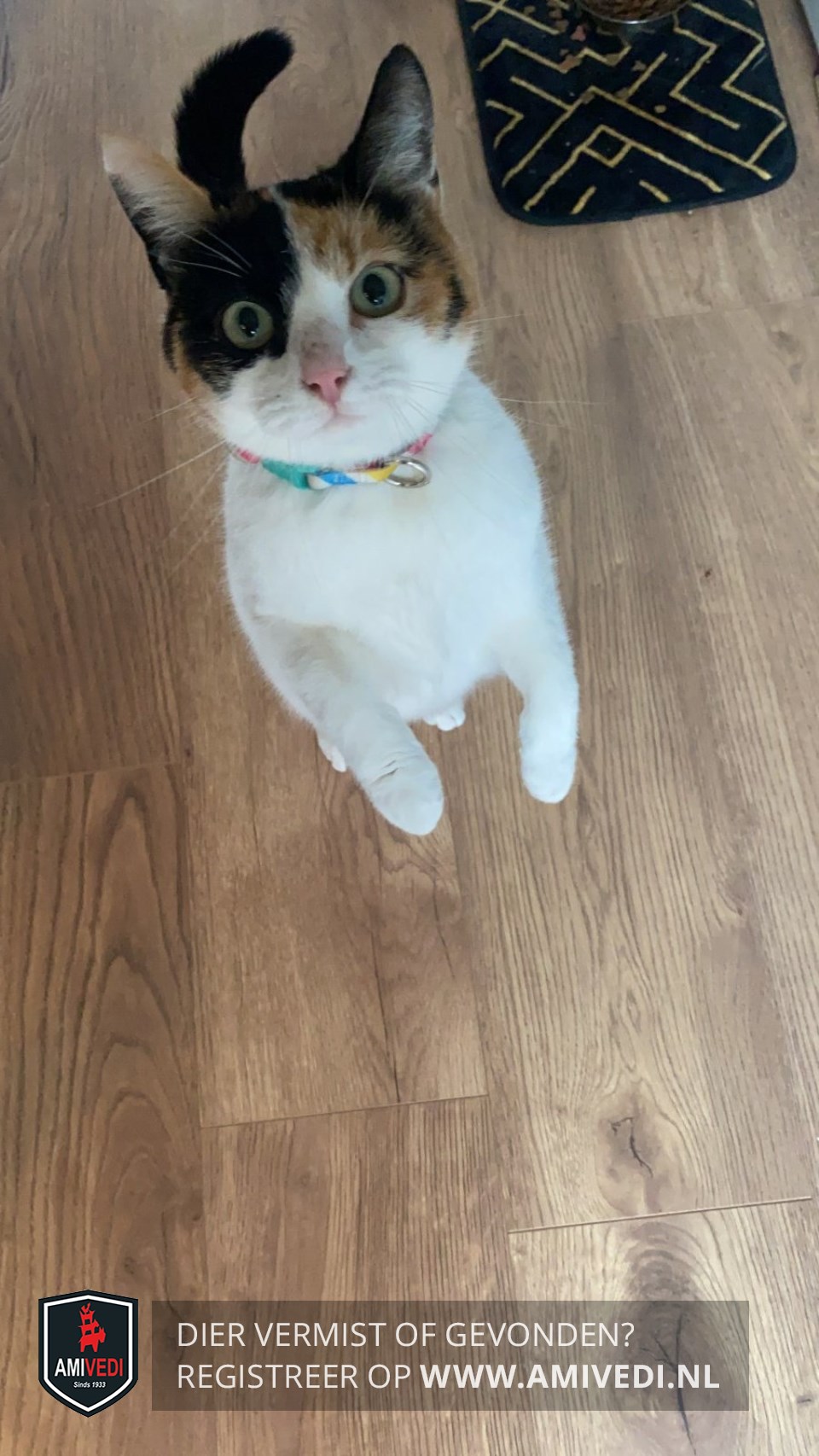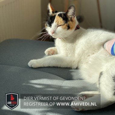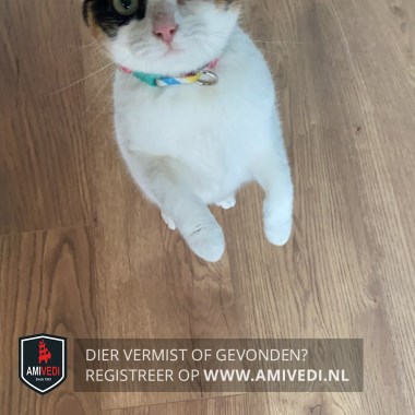 | Signalement | Kop wit, zwart om het rechter oog, rood/zwart om het linker oog, 1 rood oor en 1 zwart oor. Wat zwarte vlekjes op linker dij/heup. Staart zwart. |