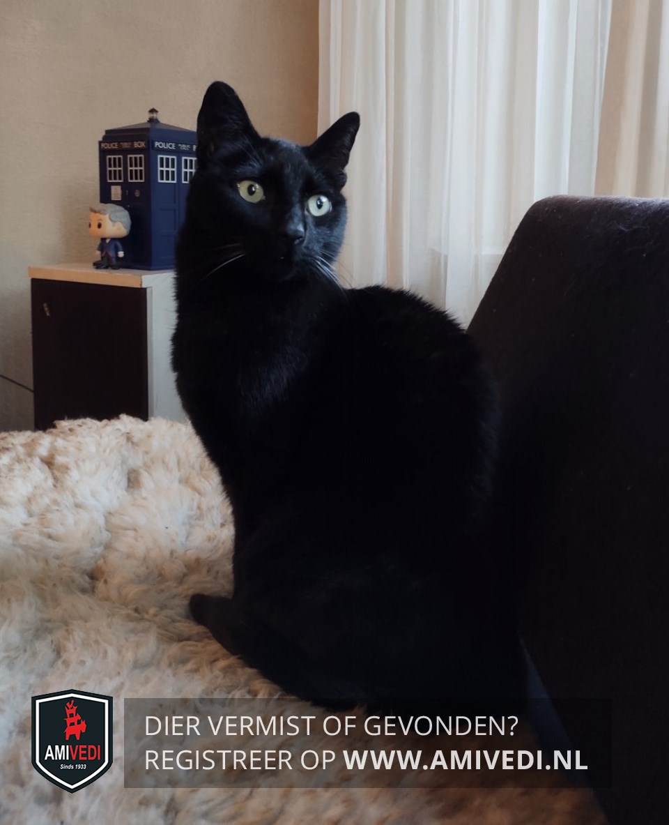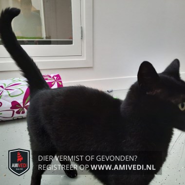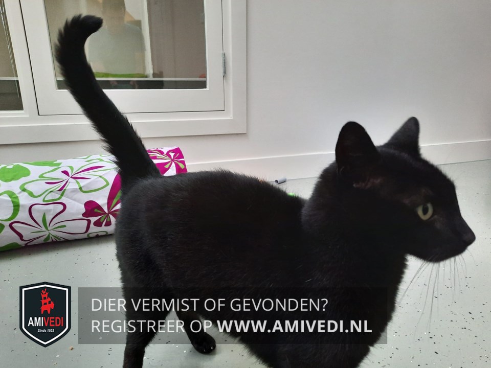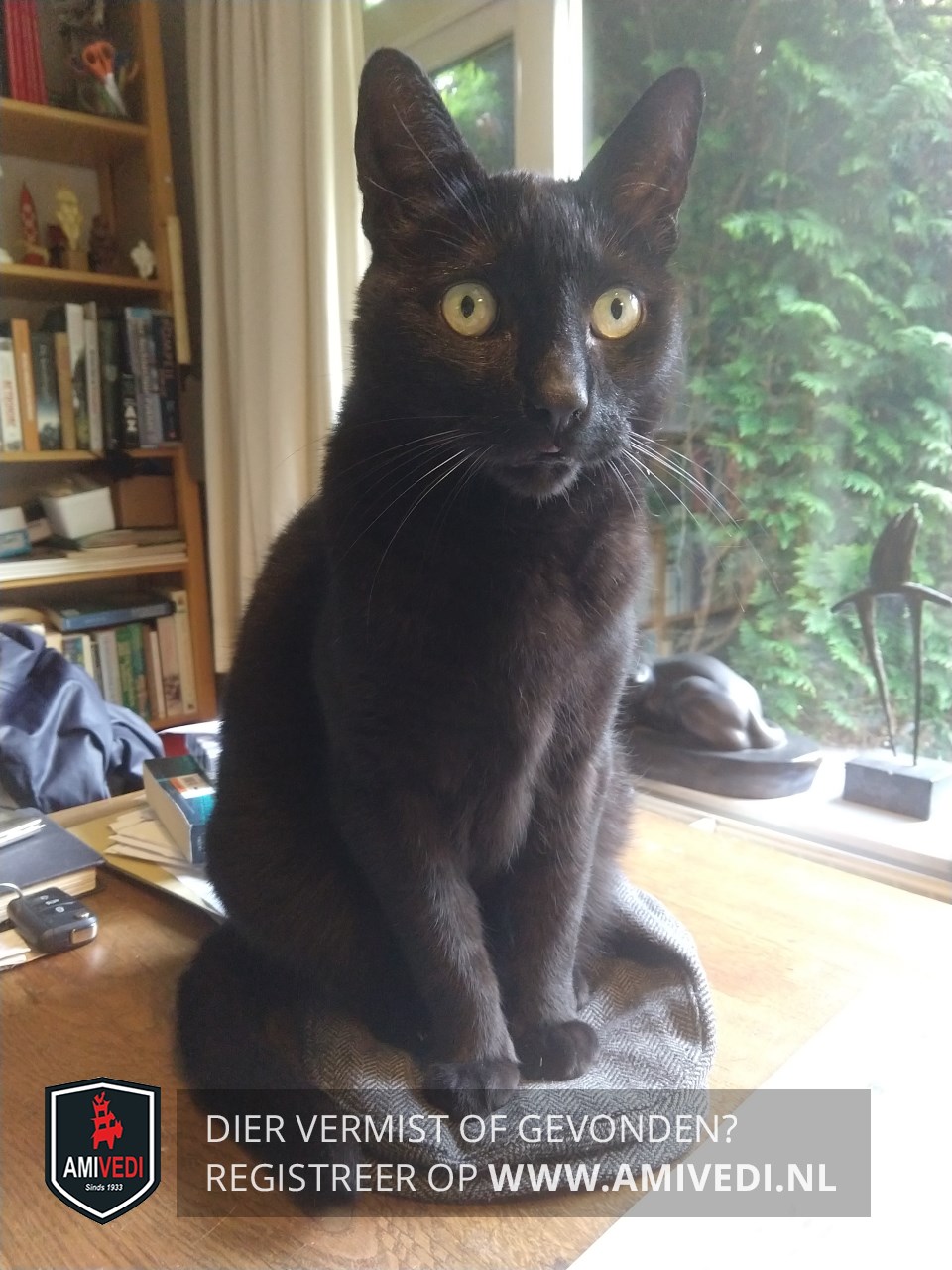 | Signalement | Effen zwarte kat. Witte snorharen. Geel groene ogen. Slank, hoog op de poten. Heeft her en der wat witte haartjes op zijn borst. Linker zijde rug een wat kalere plek. |