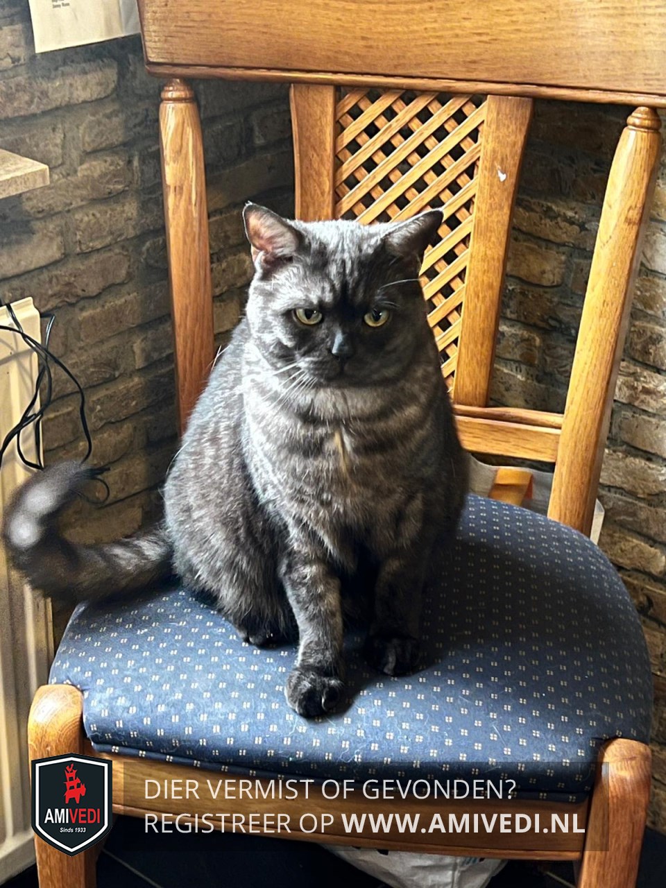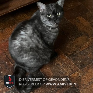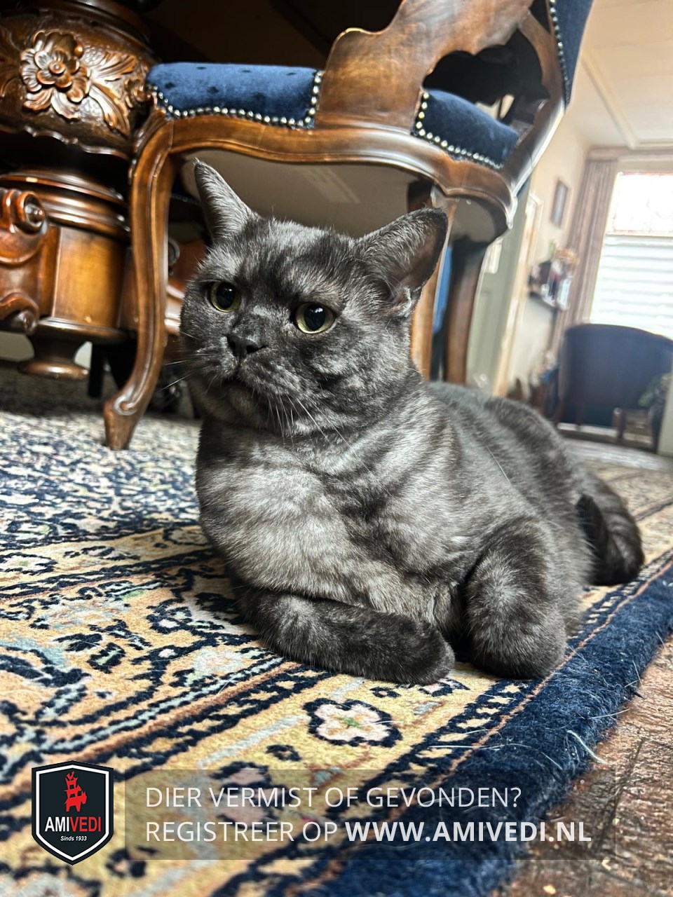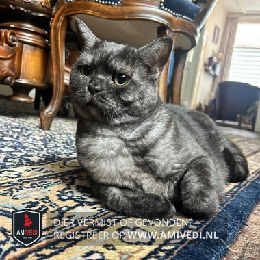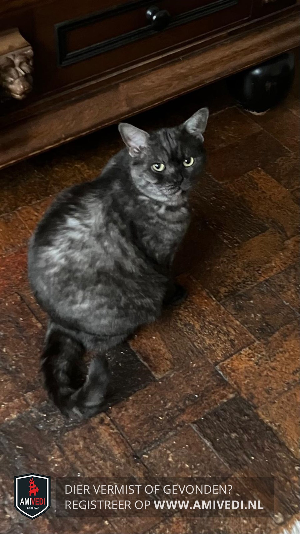 | Signalement | Zwart/grijs gemêleerde schildpad kater, smokey vacht (zwart met witte onderlaag). |