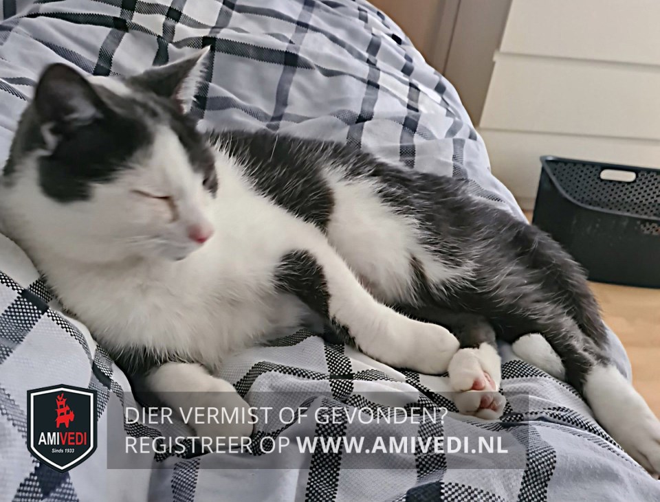 | Signalement | Donkergrijs petje met witte vlek bovenop. Grijze oren, grijs doorlopend tot onder het rechter oor, links doorlopend t/m het oog. Witte bles, neusbrug en wangen, roze neus. Witte kin met een grijs vlekje onderzijde, witte bef en borst. Donkergrijze rug en linkerdij, witte linkerflank. Rechter voorpoot wit, linker voorpoot wit met een grijze vlek aan de binnenzijde schuin doorlopend tot de kniekous. Linker achterpoot wit vanaf de sok, rechter achterpoot heeft een wit voetje. Loopt iets mank. |