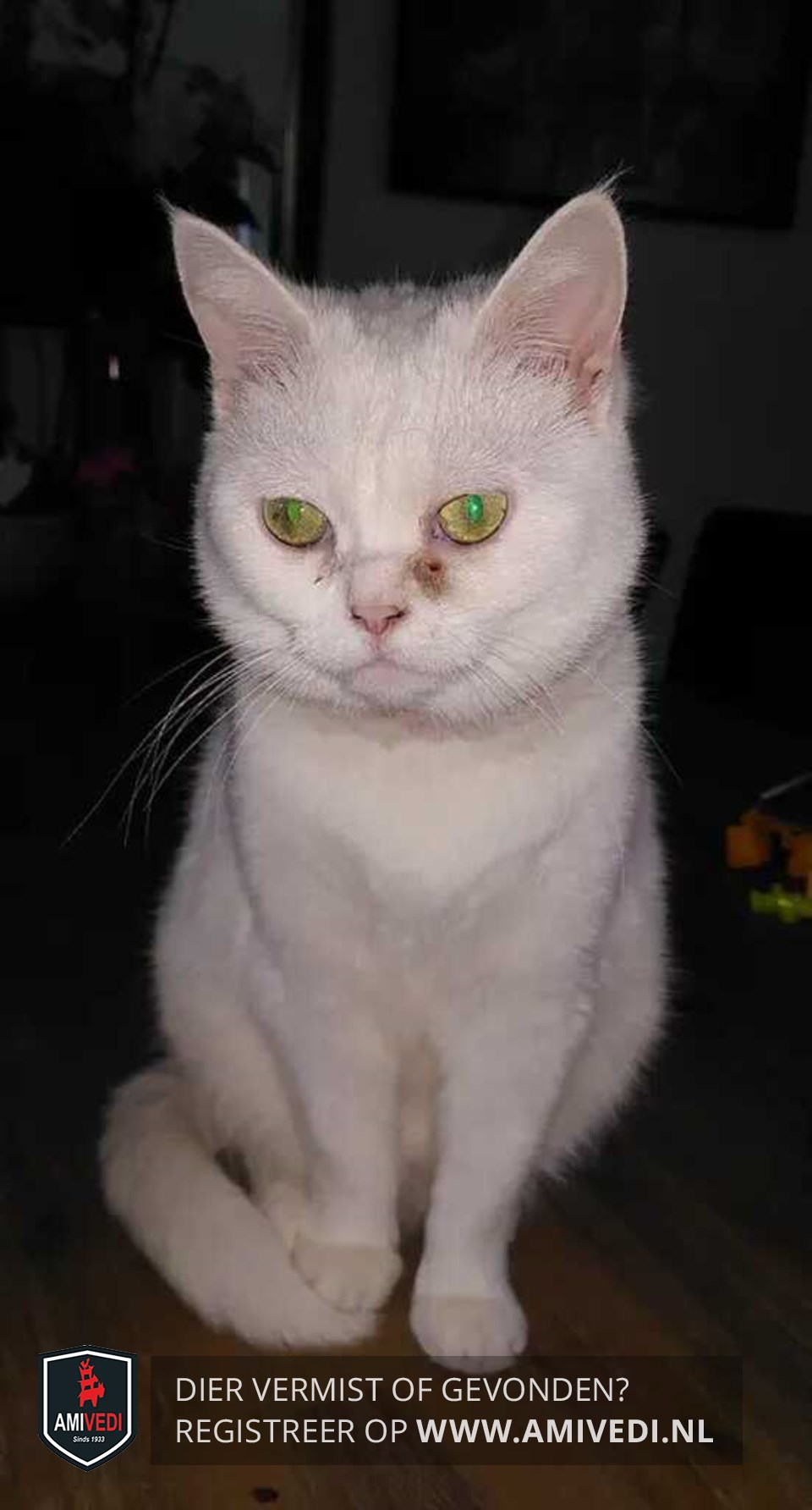 | Signalement | Witte poes, vaak wat tranende ogen, ronde kop en overbeet op de onderkaak. |