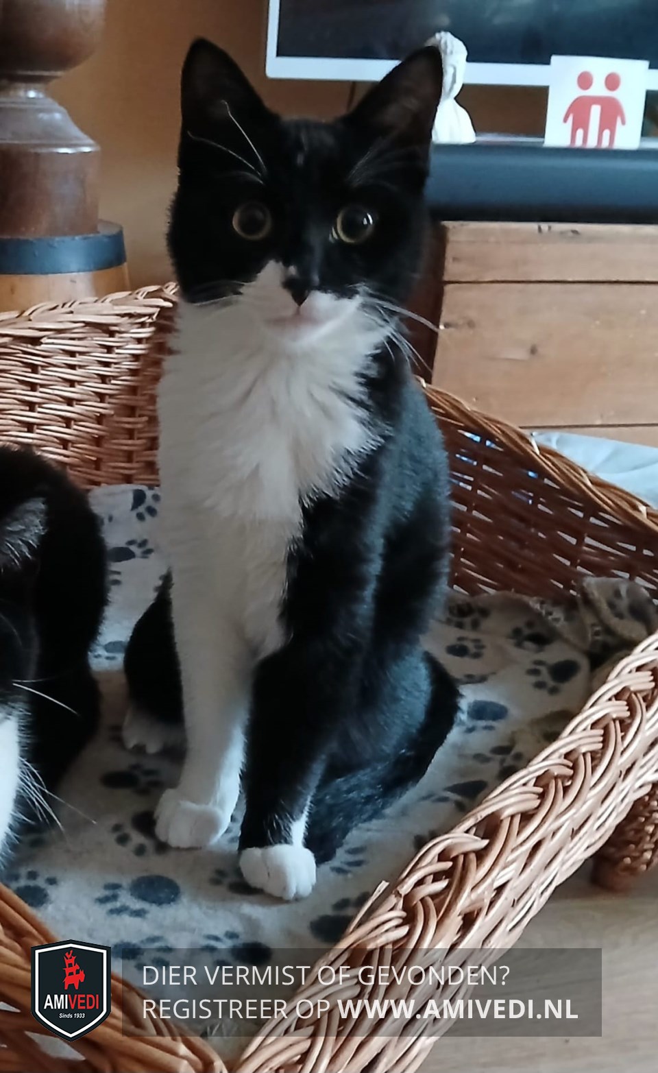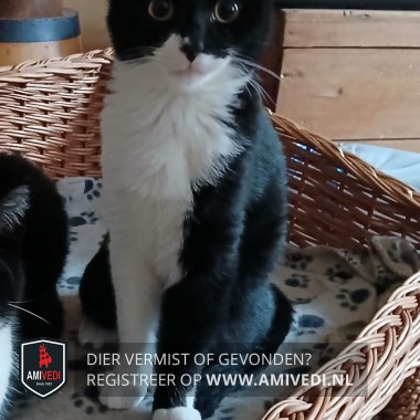 | Signalement | Voornamelijk zwart met deels witte snoet en bef, een witte en een zwarte voorpoot. Achter witte sokjes/teentjes |