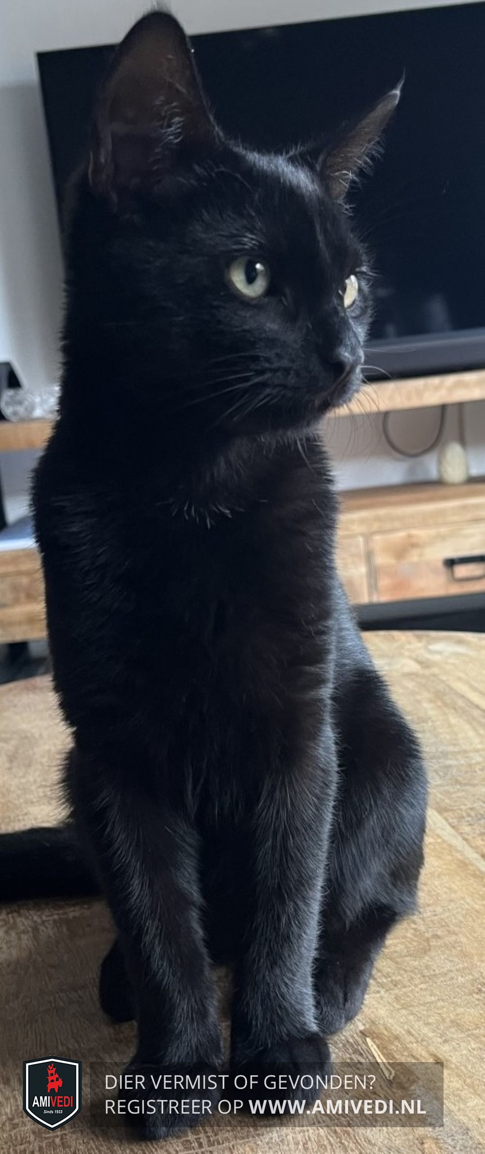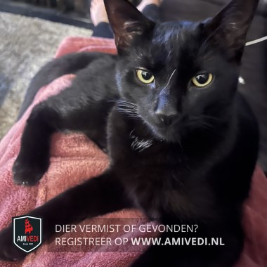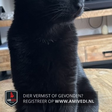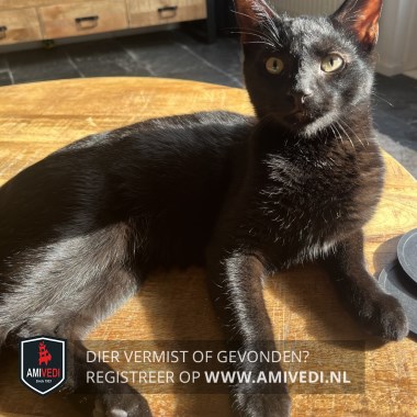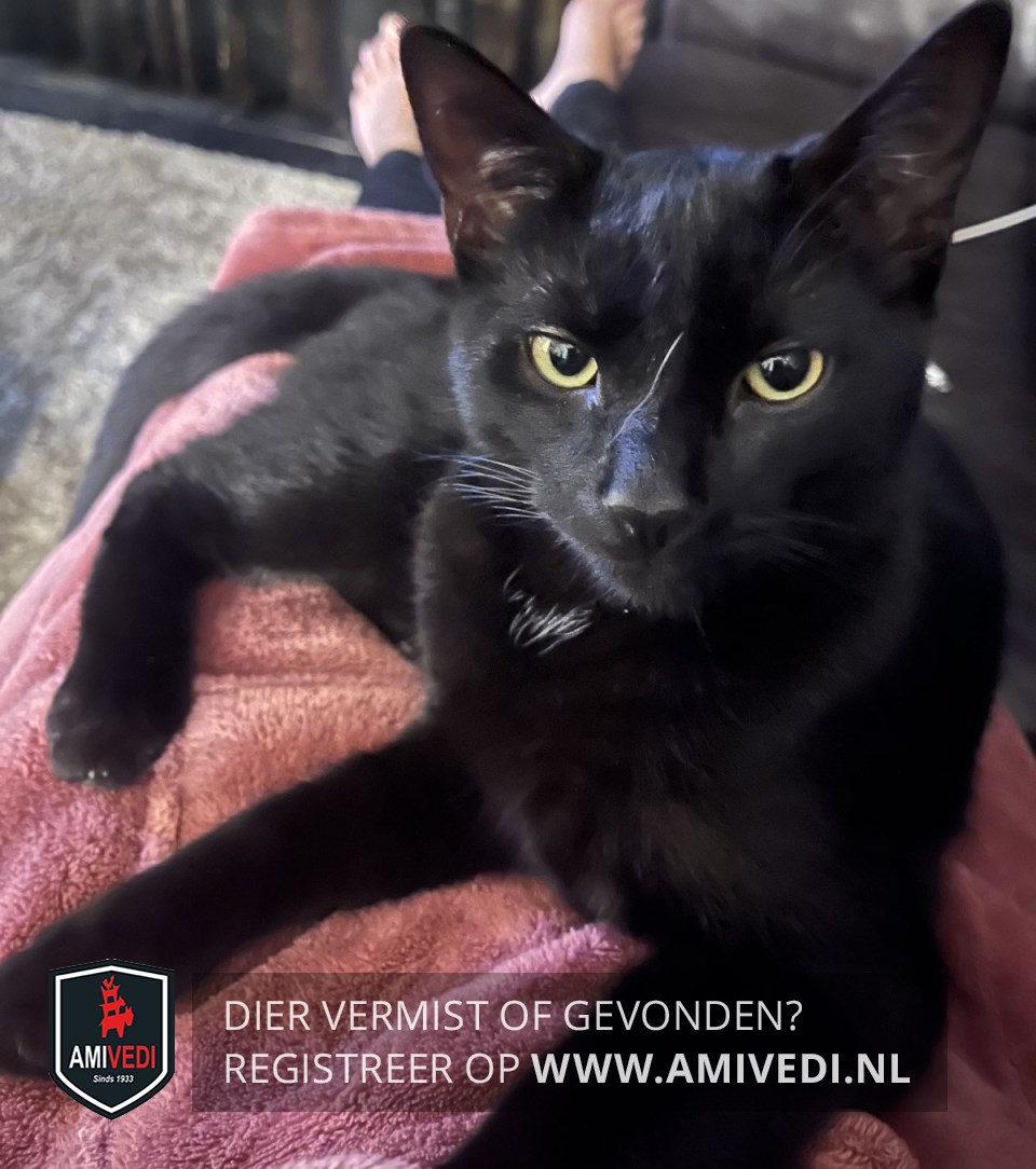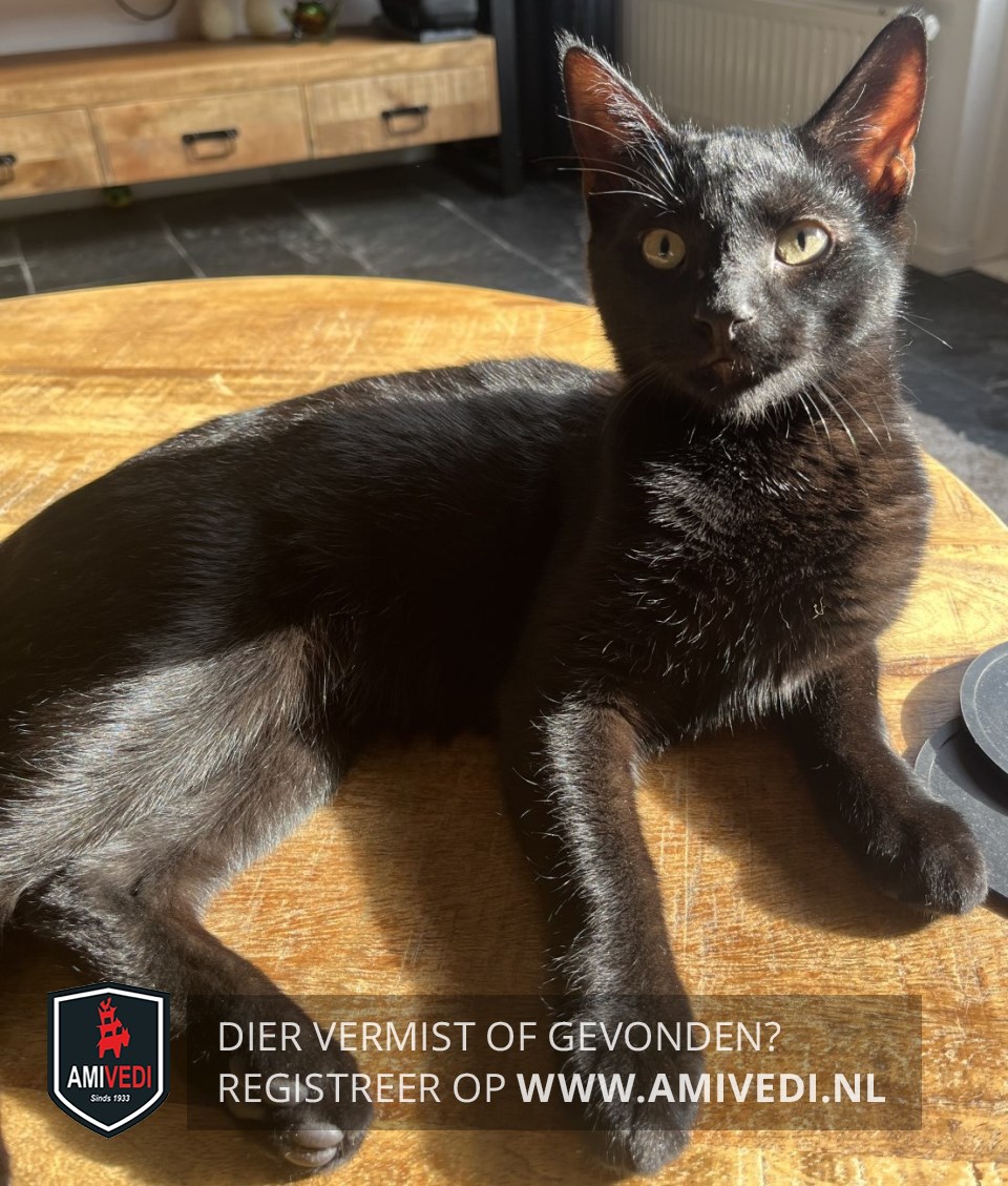 | Signalement | Geheel zwart met een paar kleine witte haartjes op borst. Grote oren. Gele ogen met een wondje naast zijn oog. Lange staart. |