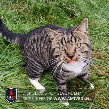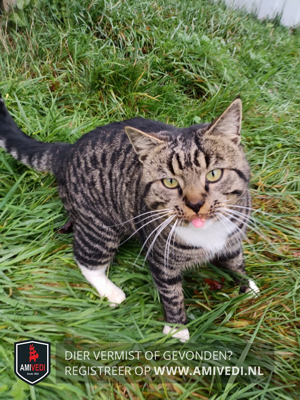 | Signalement | Cypers grijs/beige gestreept, witte borst, voorste witte teentjes, achterste witte sokjes. |