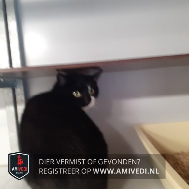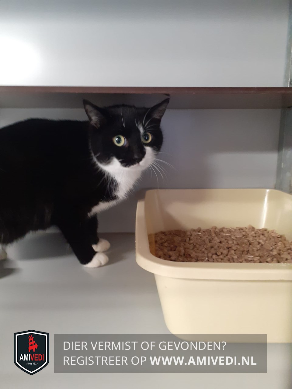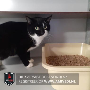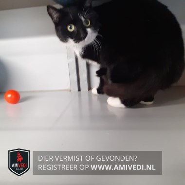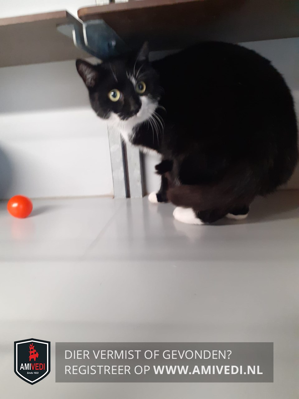 | Signalement | Europese korthaar poes zwart met wit. Wit vlekje boven linkeroog, langs linkerkant van neusje wit. Witte kin, witte bef, witte borst en witte buik. Voorpootjes witte teentjes, achterpootjes witte sokjes. |