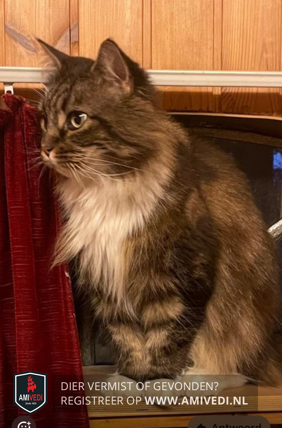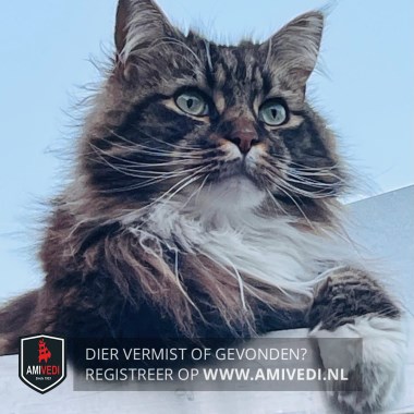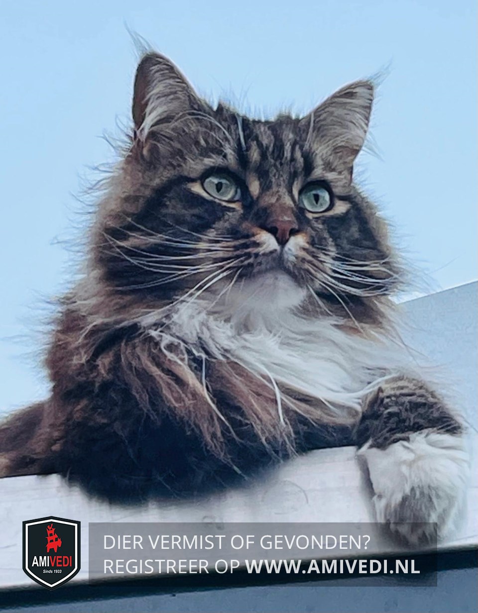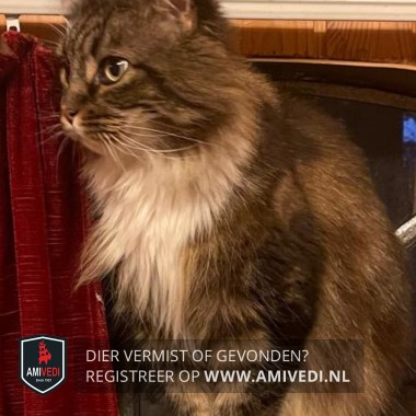 | Signalement | Langharige Maine Coon kater. Cypers. Groene ogen. Bruin/grijs koppie. Lichter rondom de snor. Witte kin, bef en borst. Lijfje bruin/grijs gemêleerd. Witte voetjes aan de voorpoten en een wit kousje aan de linkerachterpoot. |