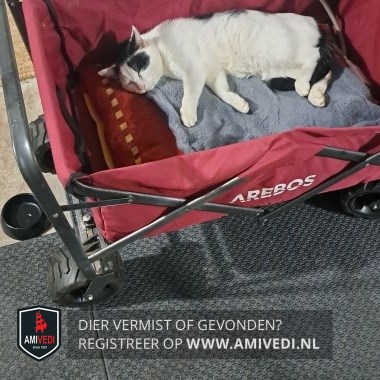 | Signalement | Wit met zwart plekje boven linker oog, zwart tussen de oren, zwarte plekken op rug en zwarte staart. |