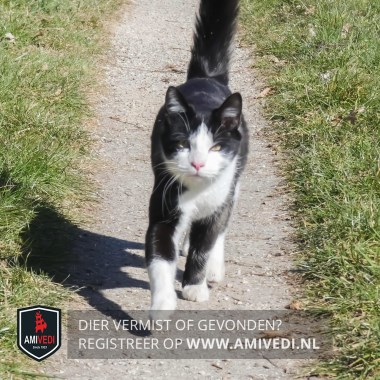 | Signalement | Zwart/witte kat met bruine ogen. Wit gezicht wat uitloopt in een driehoek tussen de oren. Witte kin en witte borst. Links voor een wit voetje en rechts voor een witte sok. Ook wit aan de achterpoten. |
