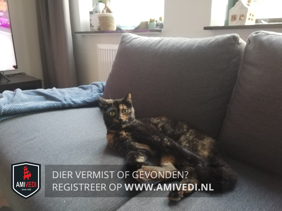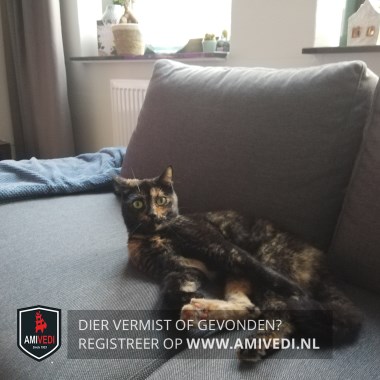 | Signalement | Schildpadpoes met wit, linkerkant rondom ogen en neusbrug linkerkant rood/oranje, rechterkant neusbrug en rondom rechteroog zwart, linkerzijkant kop naast linkeroog wit, grote witte snorharen, rechterachterpoot met wit, rechtervoorpoot met wit |