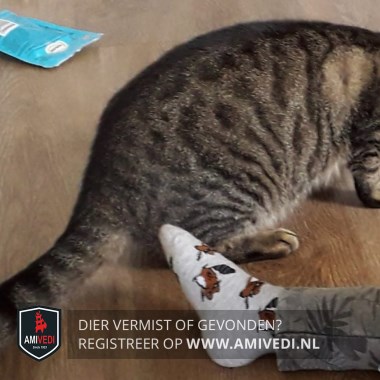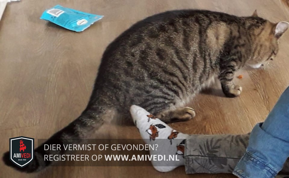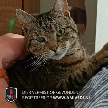 | Signalement | Cypers beige/zwart gestreept, witte kin, rechteroog is wazig. |