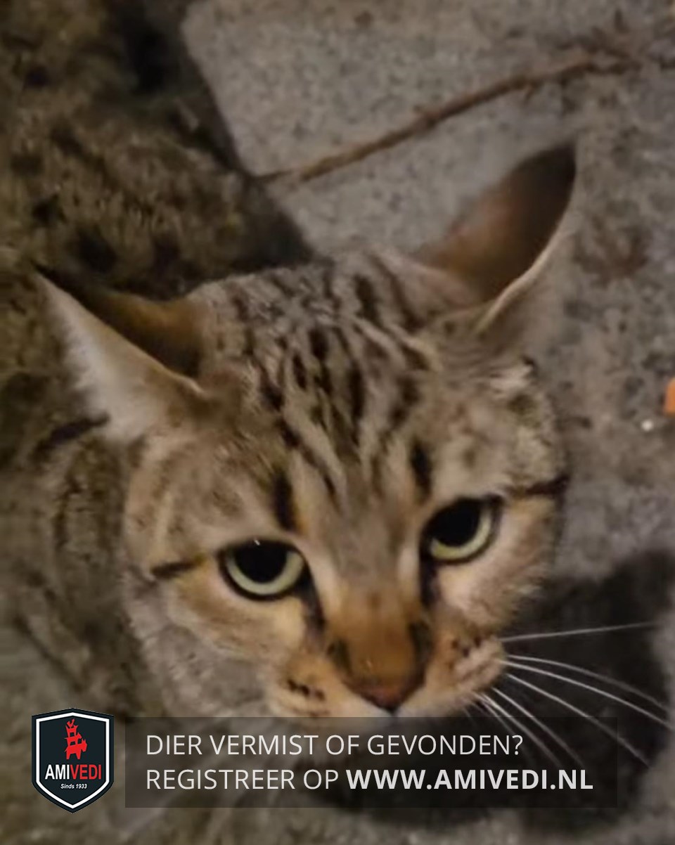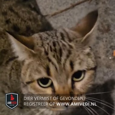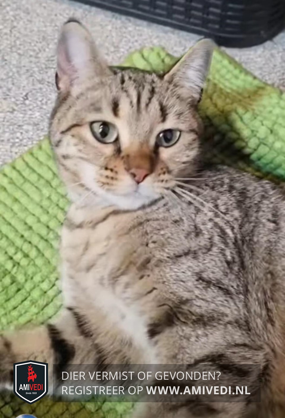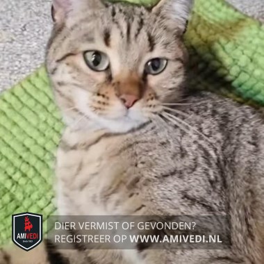 | Signalement | Bruin zwart cypers gestreepte poes met wat wit rondom de bek, gestreept lijfje en een beetje wit aan de bef. |
