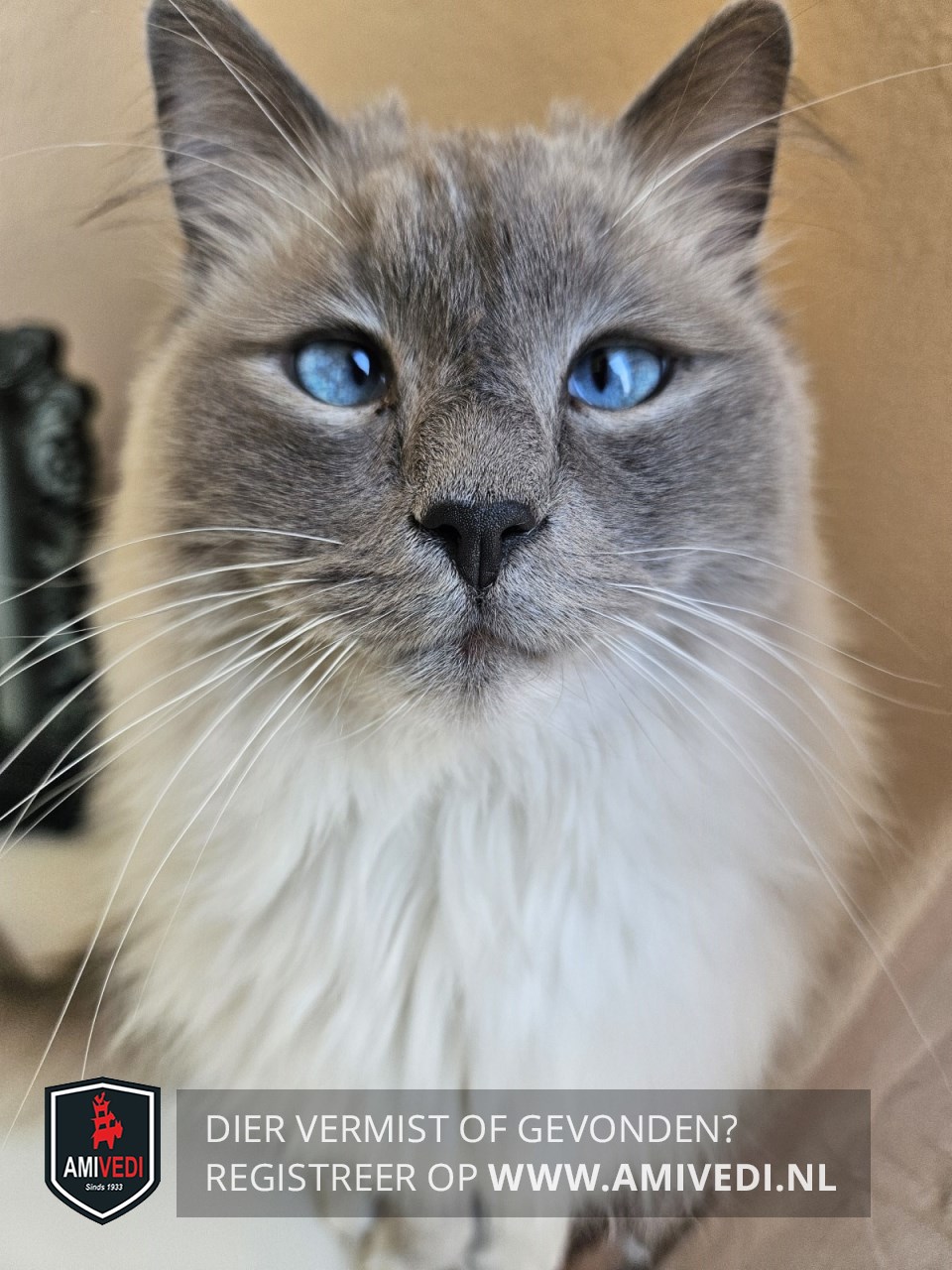| Signalement | Grijze snoet,witte borst,blauwe ogen. Blue point mitted ragdoll |
