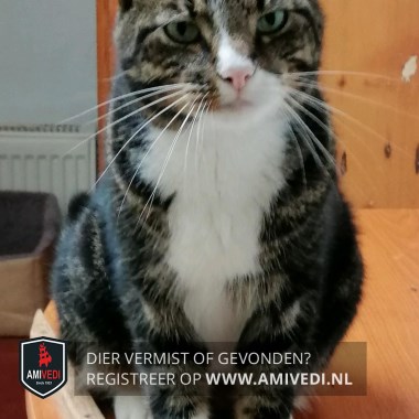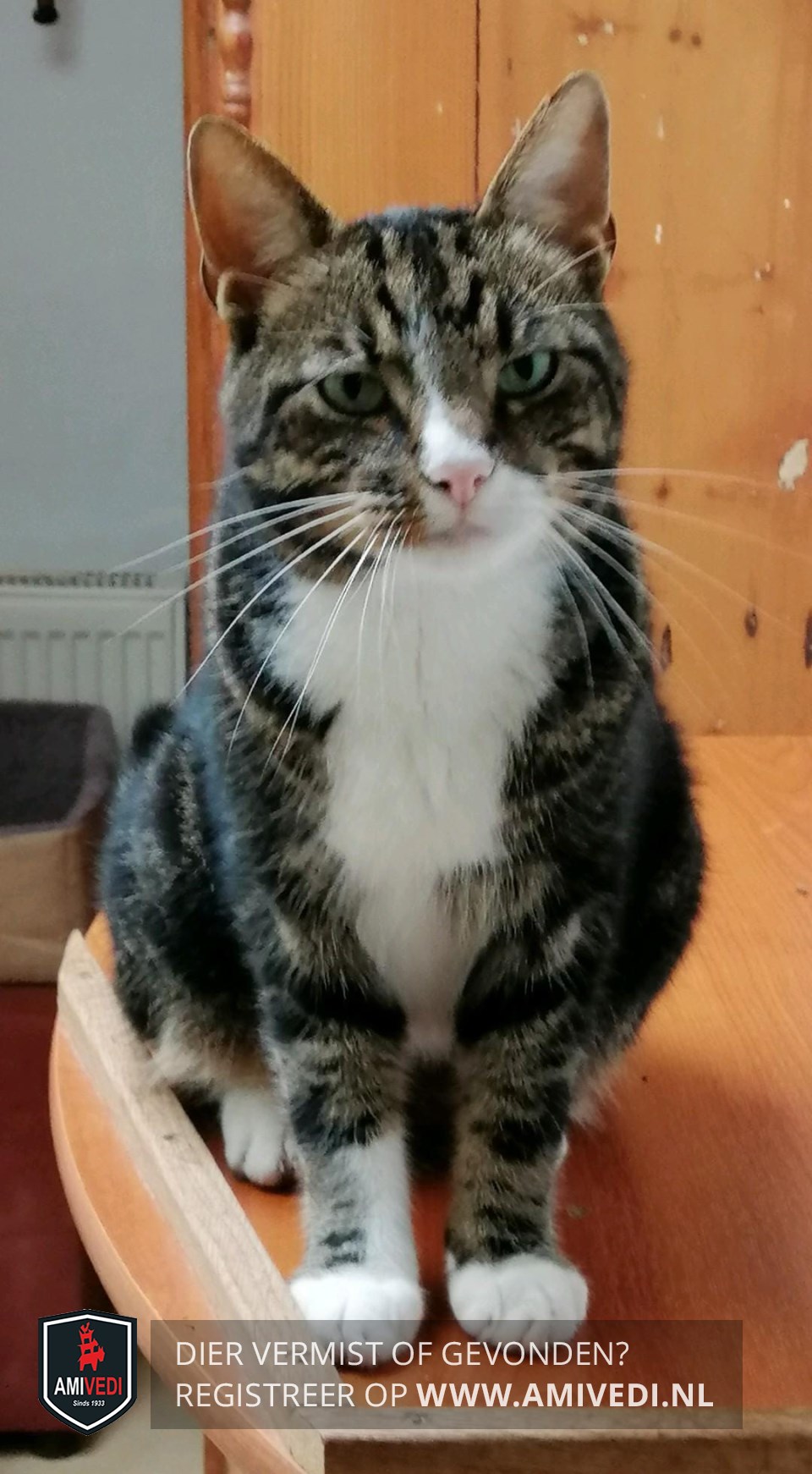 | Signalement | Grijs cypers ex kater. Met witte neus, hals, buik en witte pootjes. Witte snorharen. |