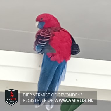 | Signalement | Rosella Parkiet (Crimson-rosella) rode borst rode rug en hoofd, blauwe staartveren en blauwe vlek links van de snavel, vleugels streeppattoon in wit met zwart en beetje blauw. Rechterpoot heeft zwelling boven de ring. Redelijk tam. |