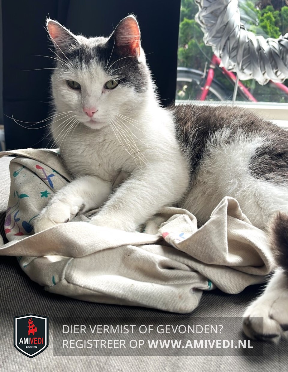 | Signalement | Wit met grijs. Voornamelijk wit, bovenop de kop en voor de oren grijs, links doorlopend langs de ooghoek tot de wang, roze neusje, op de rug grijs, staart grijs. Kleine kat. |