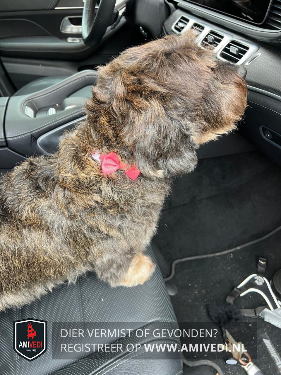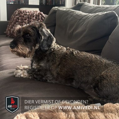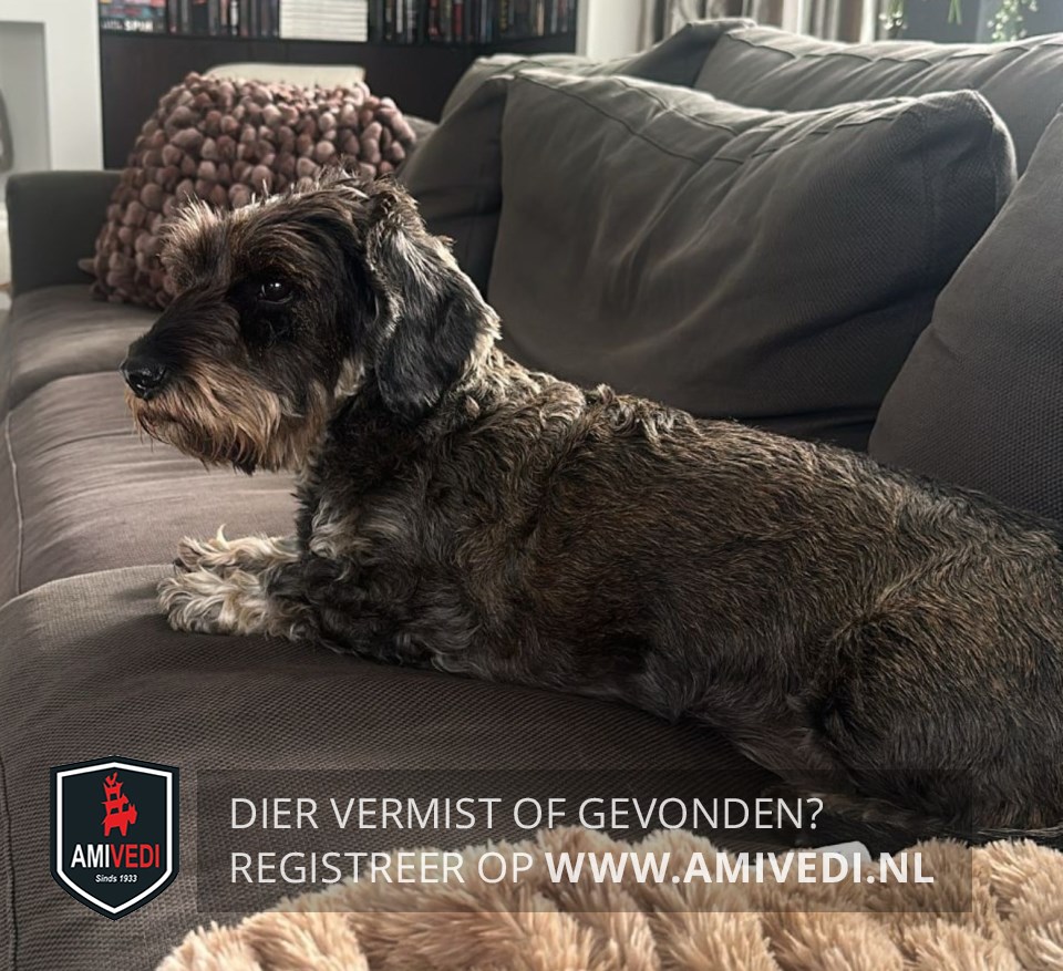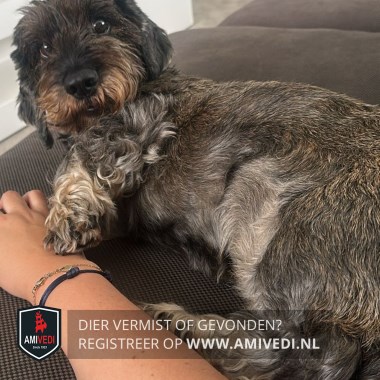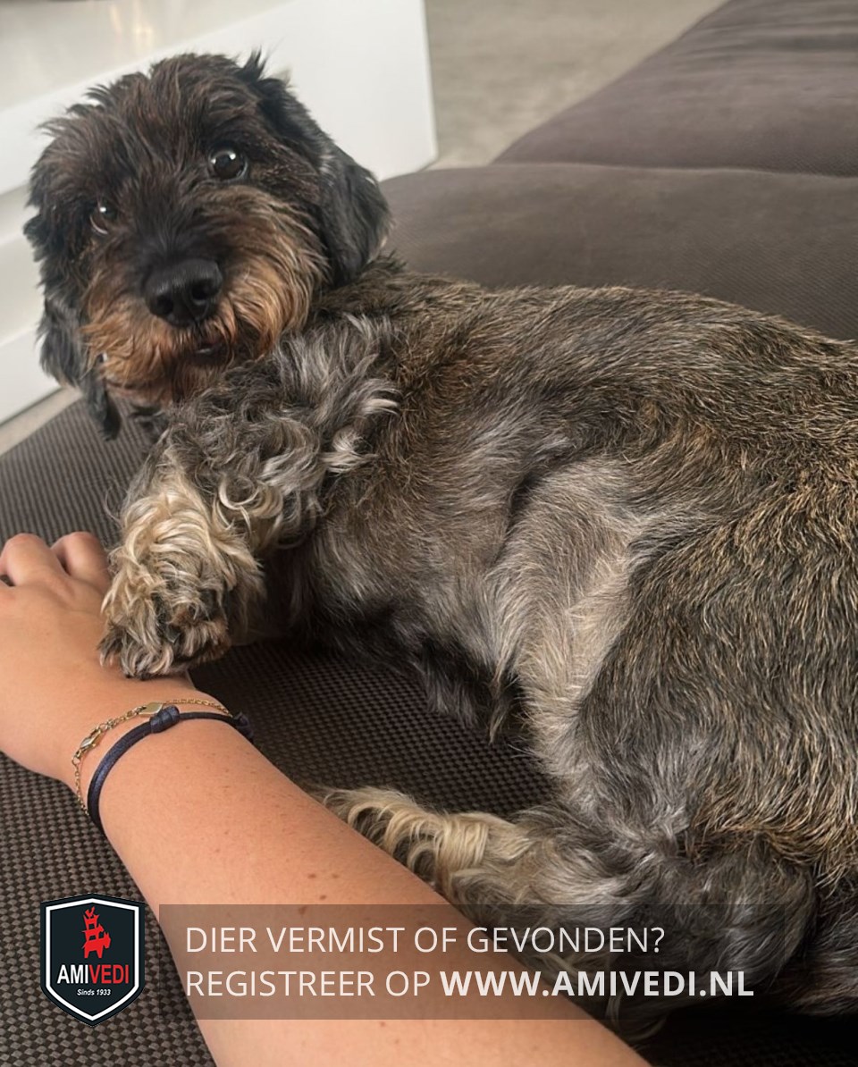 | Signalement | Ruwharige teckel, bruin met zwart gemêleerd. Zijkanten snuit en kin bruin. |