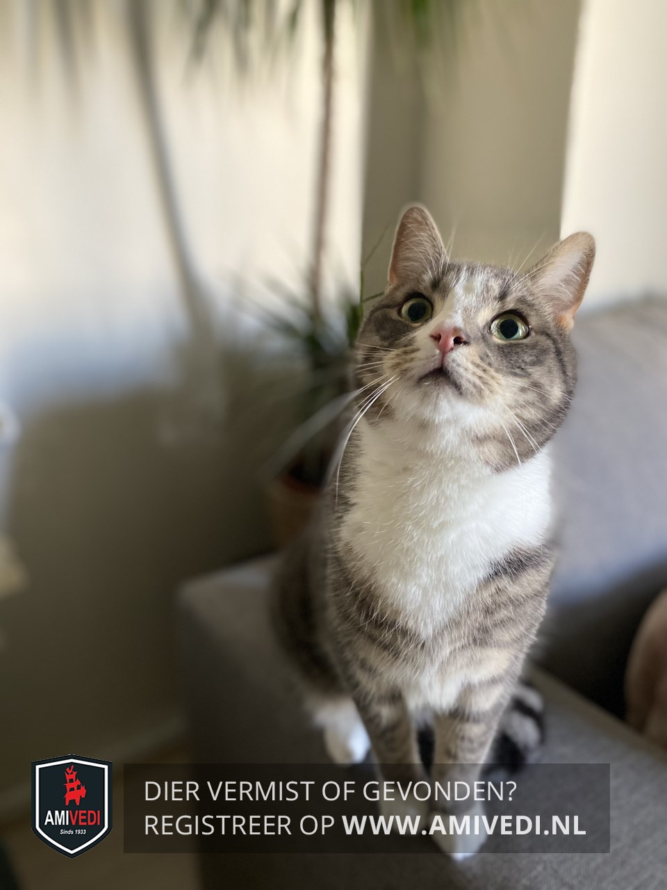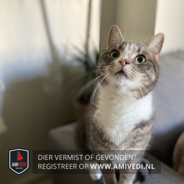 | Signalement | Cypers gestreepte grijs witte kat, met een wondje bij zijn oor. Witte bles, snuit en bef , witte teentjes aan de voorpootjes en witte laarsjes aan de achterpootjes. |