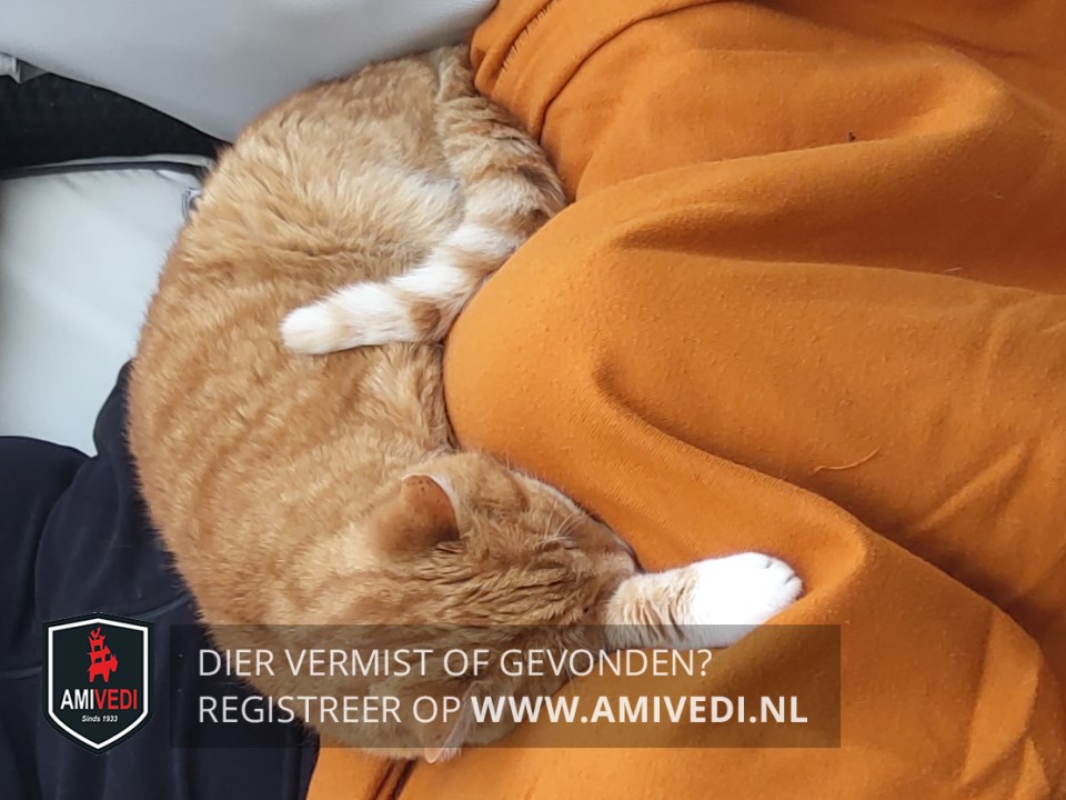 | Signalement | Geheel rood/wit gestreept met wit onder de kin en bef, witte sok aan de voorpoot, geringde staart met witte punt |