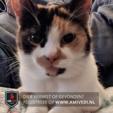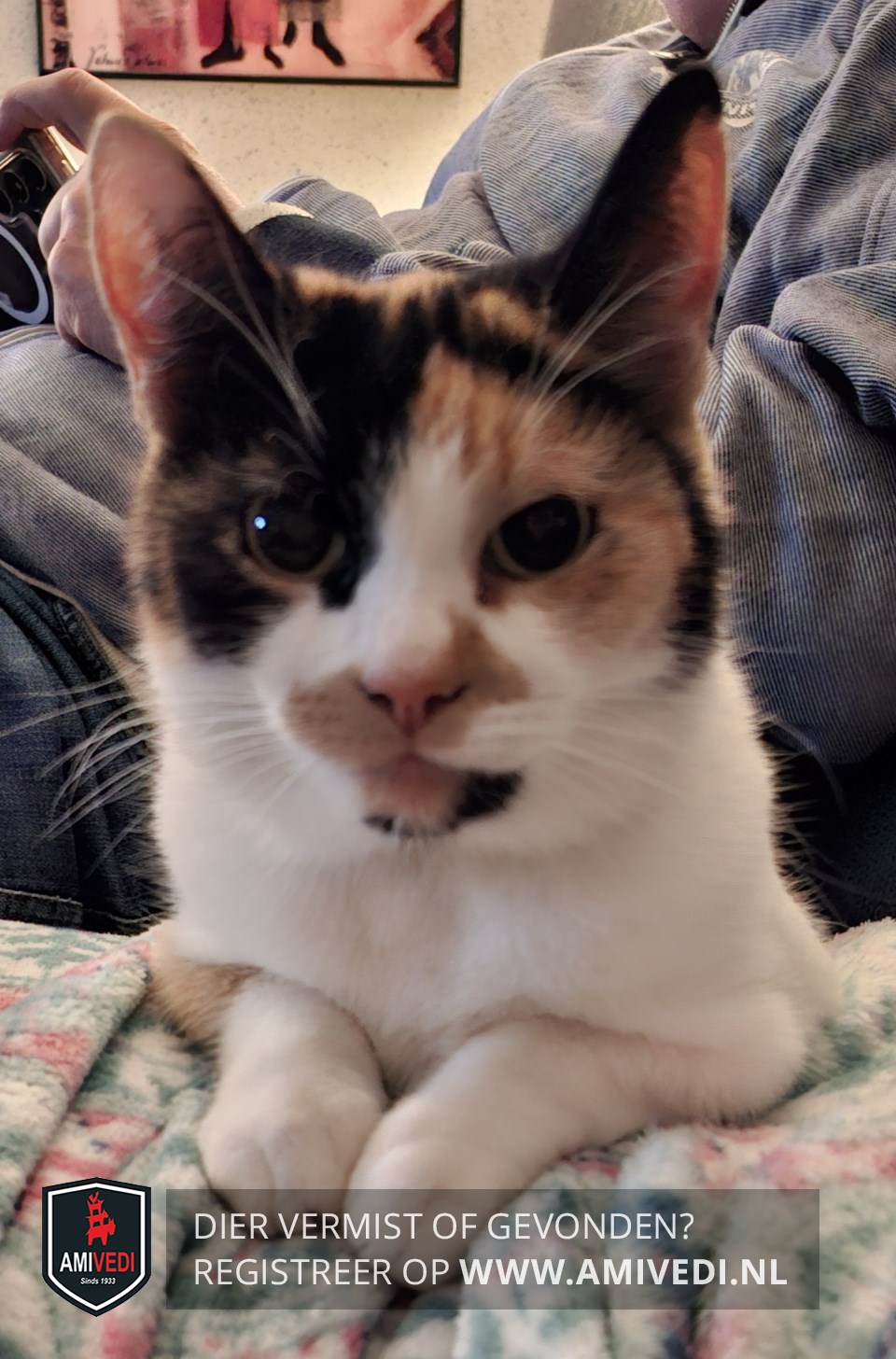 | Signalement | Lapjespoes, wit met zwart en rood gevlekt. Witte snuit met rond neus rode vlekjes en zwart kinnetje. Witte hals, bef, borst, buik, pootjes. Erg schuw naar anderen. Draagt een vlooienband. |