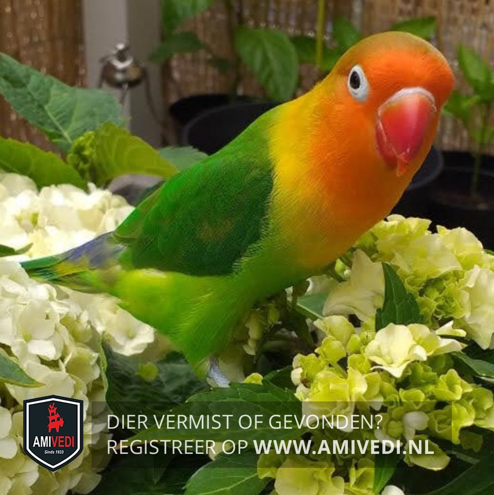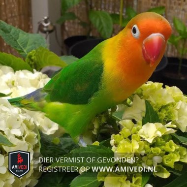 | Signalement | Rode snavel, Oranje kopje, gele hals, groen lijfje, klein beetje blauw bij staartpunt. Niet geknipt, vliegt goed en is tam. |