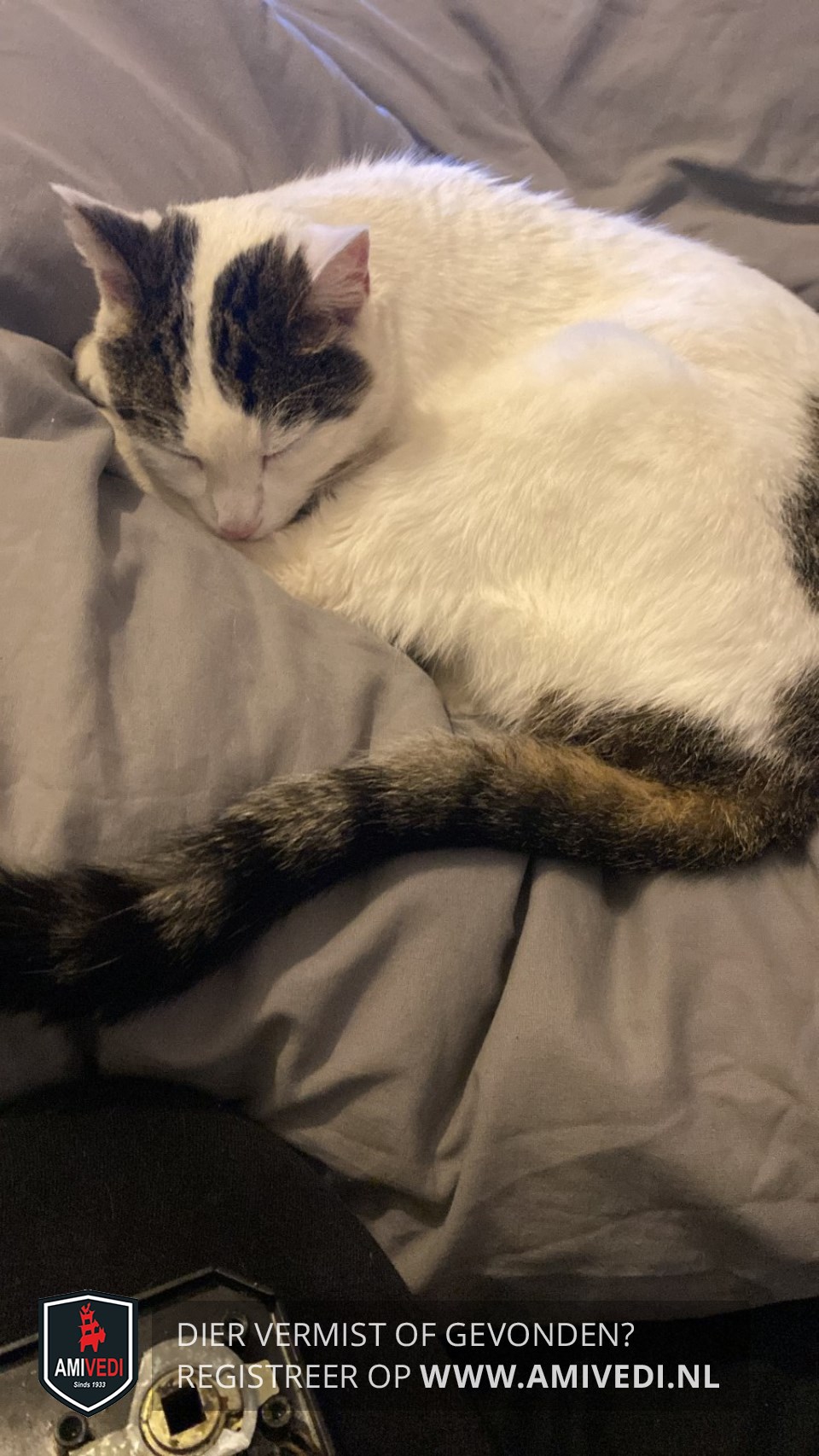 | Signalement | Witte kat met bruin zwart cypers gestreepte oortjes. Paar gestreepte vlekken op zijn rug en een grijs zwart geringde staart, voor de rest helemaal wit . |