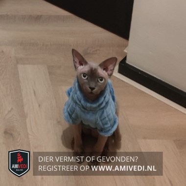 | Signalement | Sphynx kat met blauw truitje harige voetjes |