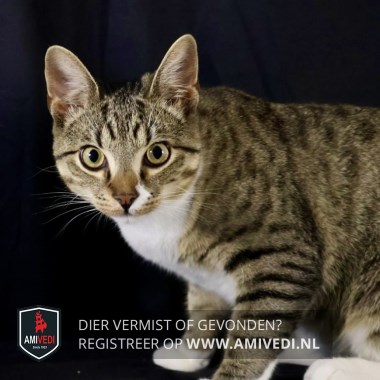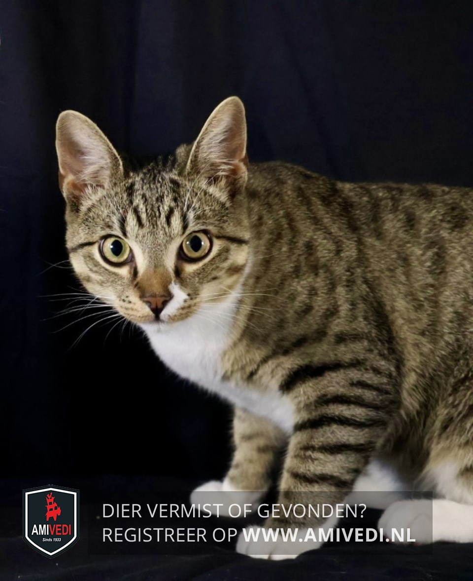 | Signalement | Cypers bruin/zwart met wit. Links van de neus wit vlekje. Kin, bef en borst zijn wit. Beide voorpoten witte voetjes. Beide achterpoten witte kousjes. |
