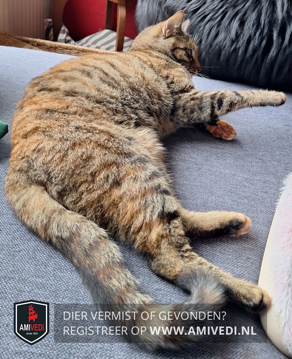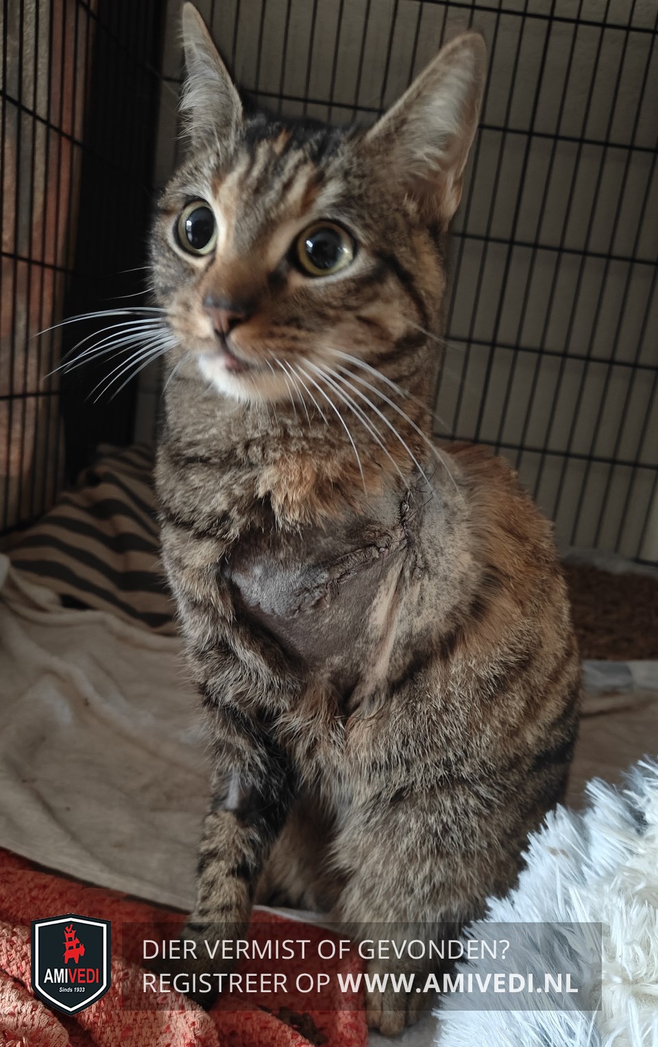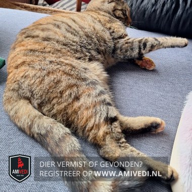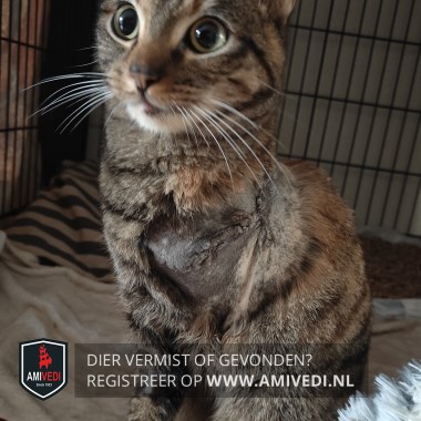 | Signalement | Cypers bruin/zwart gestreept met wit, op rechterkant boven bekje een wit vlekje, witte kin, witte snorharen, zwart vlekje onder het bekje, op de borst een kaalgeschoren vlek, mist linker voorpoot, krijgt medicatie/pijnstilling in verband met amputatie |