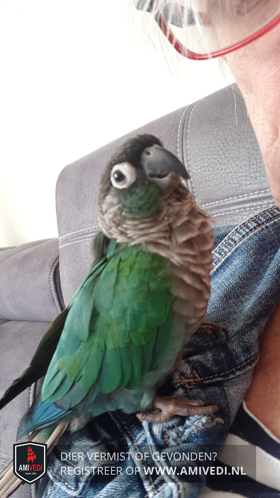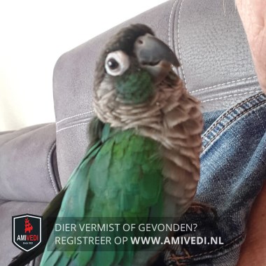 | Signalement | Kop donkergrijs, witte ring om de ogen, wangen groen, rechter oogje is kleiner dan haar linkeroogje. Borst/nek lichtgrijs. Vleugels groen met blauwe punten. |