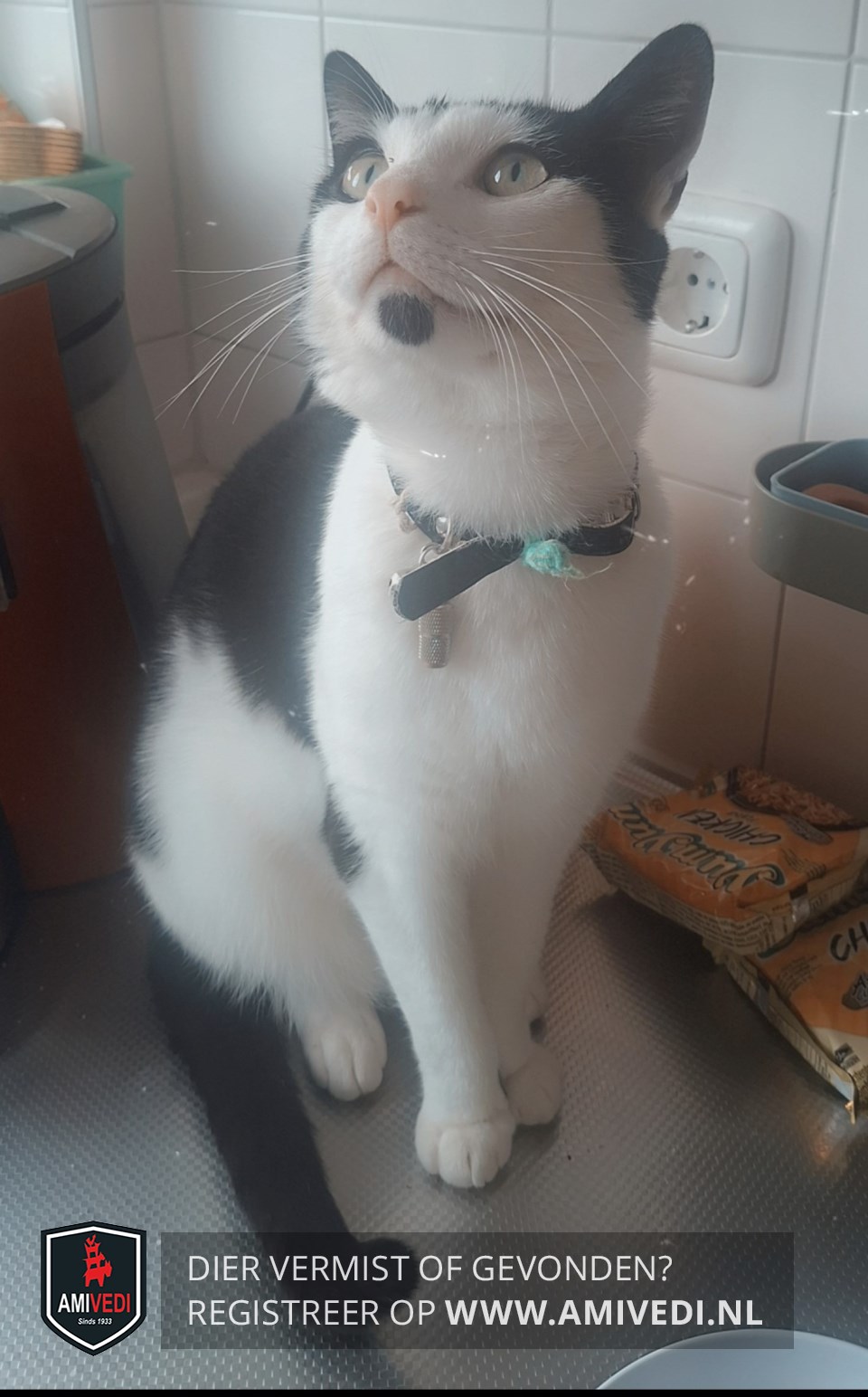 | Signalement | Zwart/wit Wit gezicht met een opvallend zwart vlekje onder zijn kin. Witte borst en poten. Zwarte staart. |