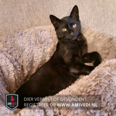 | Signalement | Klein katertje Zwarte glanzende korte vacht Klein wit plukje op onderbuik en nek |
