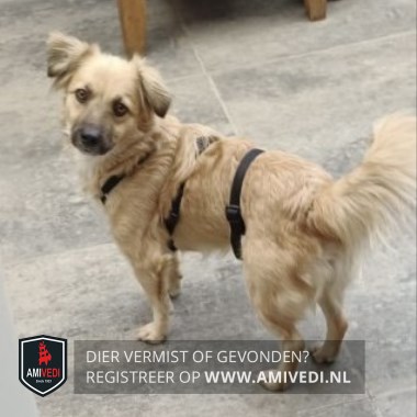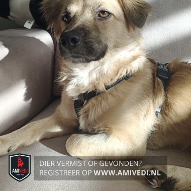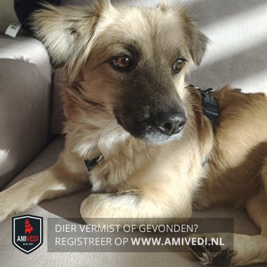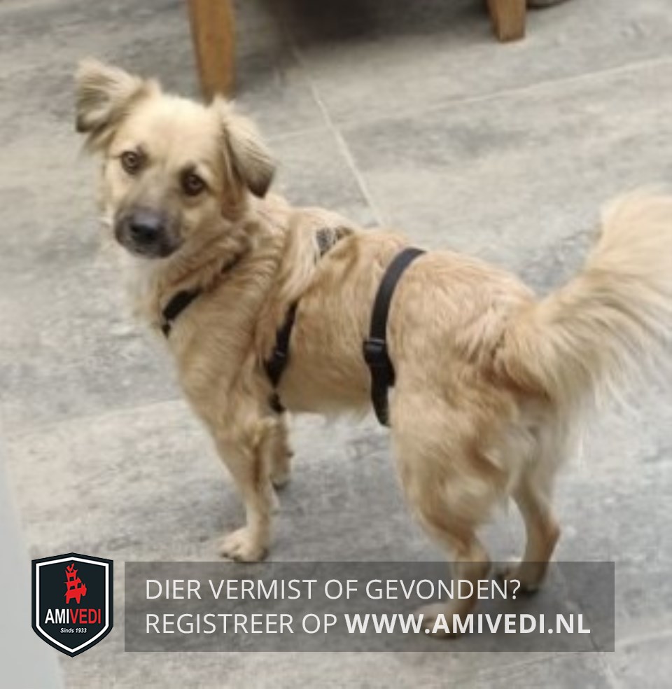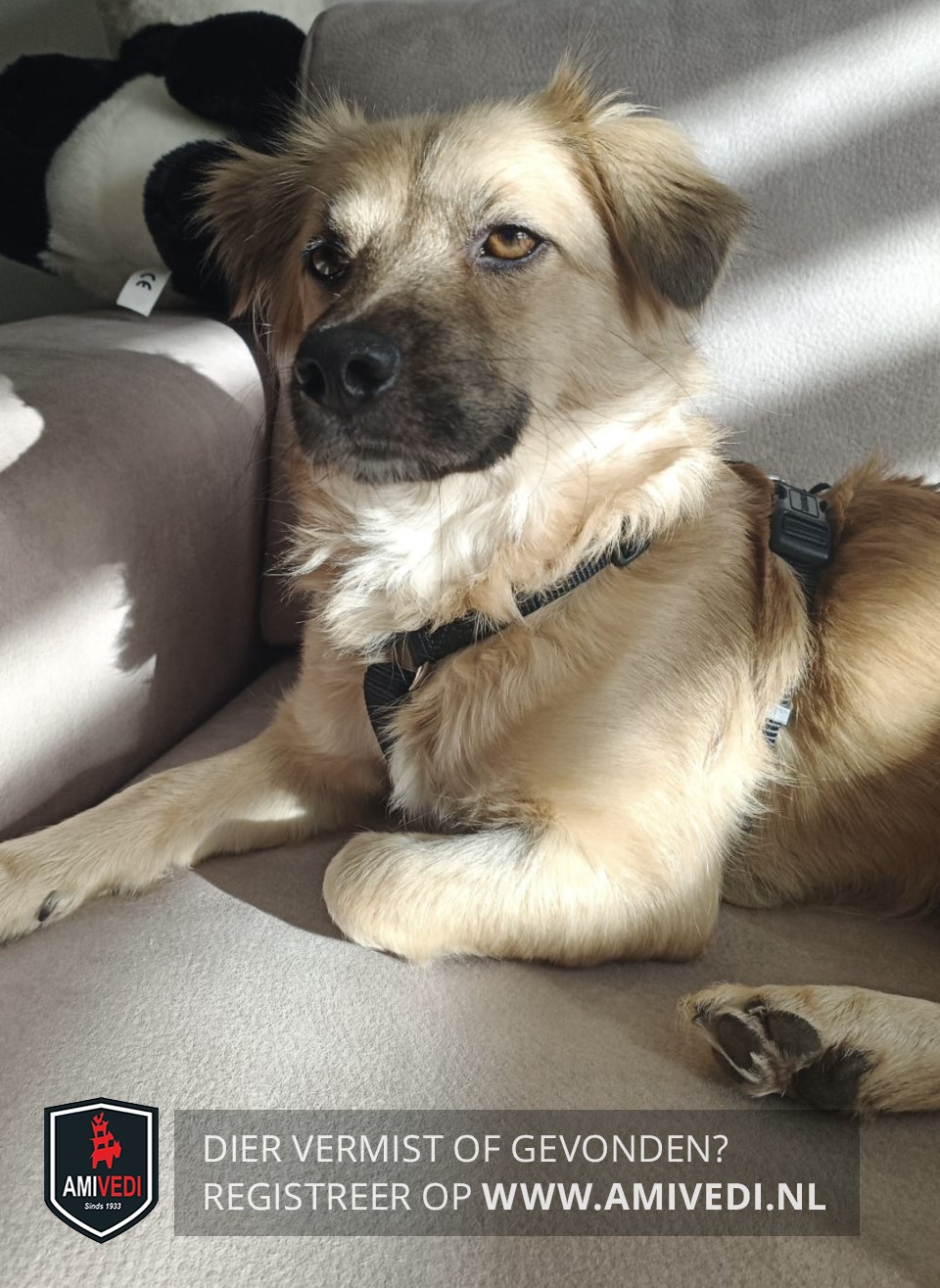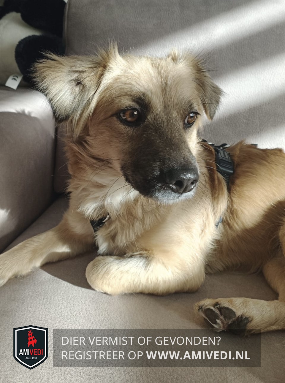 | Signalement | Kruising, teef. Witte borst en achterwerk. Zwarte snuit en rand oren. Spitse snuit, hangende oren. Licht bruine ogen. |