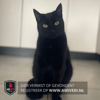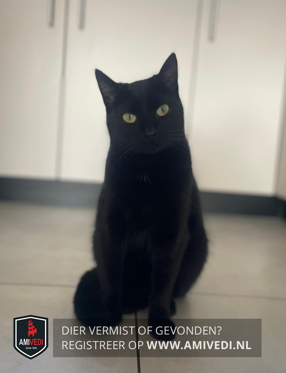 | Signalement | Bijna geheel zwarte katertje met wat witte haren op de borst.. Wat schrikkerig. Heeft dikke wintervacht en is graag buiten. |