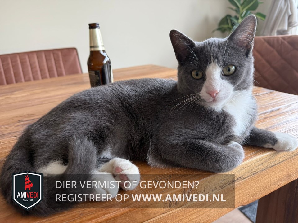 | Signalement | Grotendeels grijs met witte pootjes. Witte snuit en bef. Voor witte teentjes, achter witte sokken. |