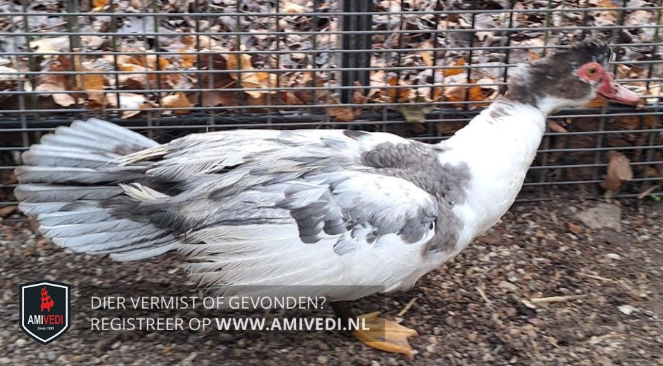 | Signalement | Muskus eend. Wit met bruin op de kuif, het voorhoofd, de nek en een bruine vlek op de rug. Wit met bruin op de vleugels en de staart. |