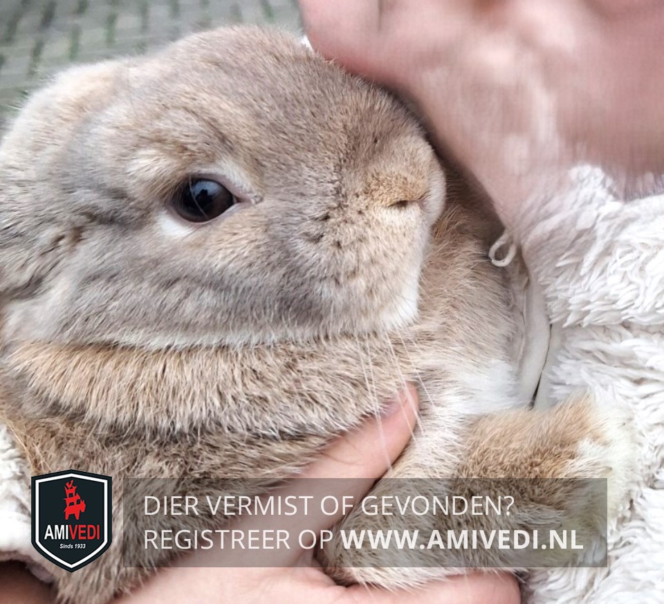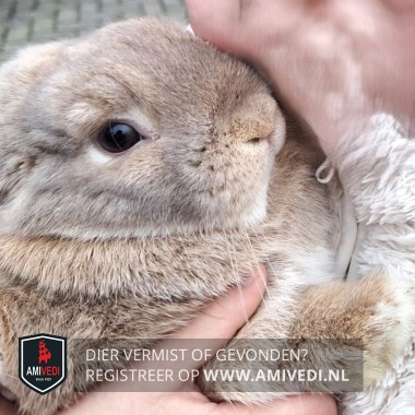 | Signalement | Beige met wit. Voornamelijk beige, onder de kin een beetje wit, op de borst een beetje wit. Heeft een kaal plekje op de rug achter de nek. Hangoorkonijn. |