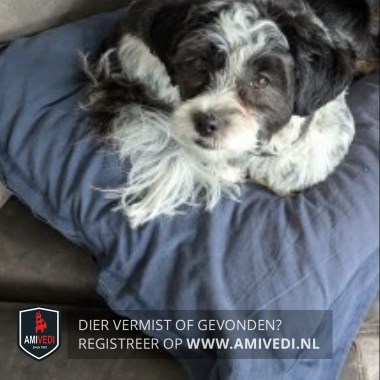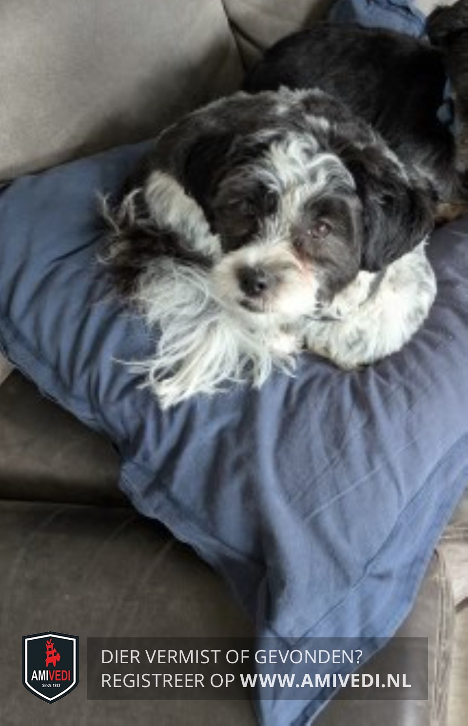 | Signalement | Boomer, licht gekruld, zwart wit gevlekt, zwarte oren, zwart rond ogen,. |
