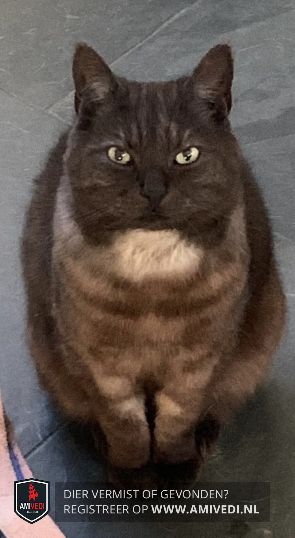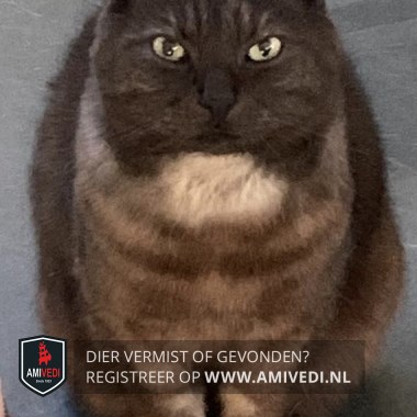 | Signalement | Kop zwart, vage cyperse tekening op het voorhoofd. Beige bef, borst bruin met donkere strepen. Voorpoten bruin/beige met zwarte voeten. Rug zwart/bruin gemêleerd. Bijzondere vacht, donker tot je aait, ondervacht is wit. |