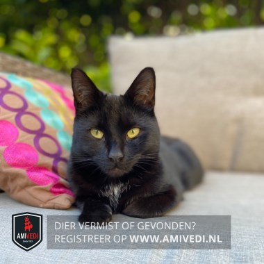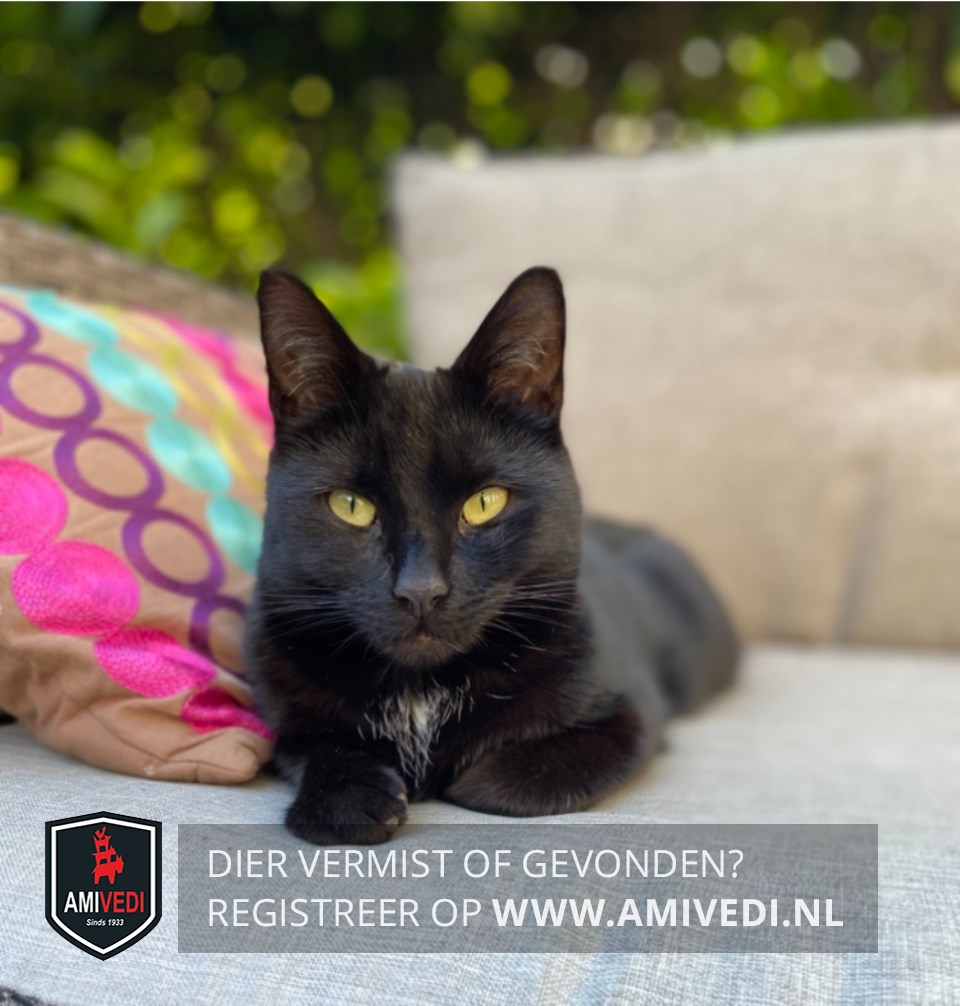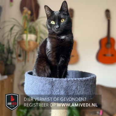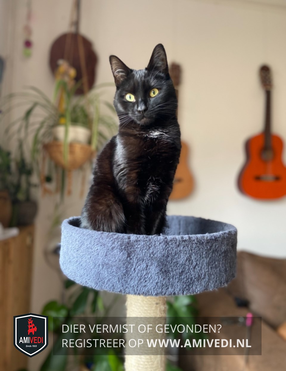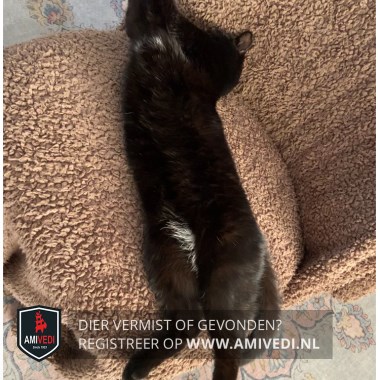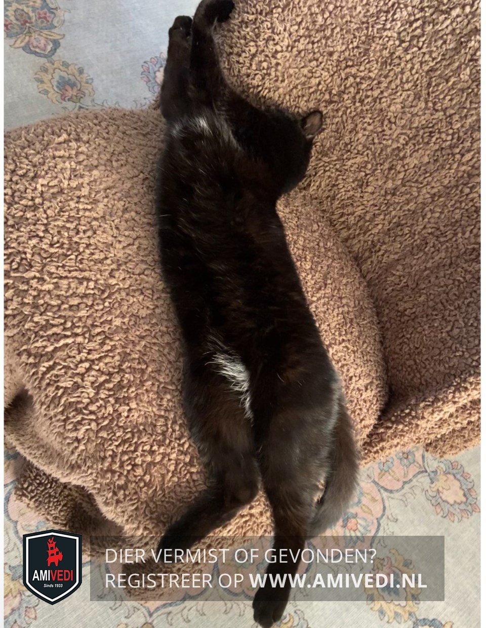 | Signalement | Klein, dun zwart poesje met wat witte haartjes op de borst en achterop haar buik tussen de achterpoten. Ze houdt ervan in schuren, auto’s en bestelbussen te klimmen. Ze krijgt veel eten maar blijft dun. |