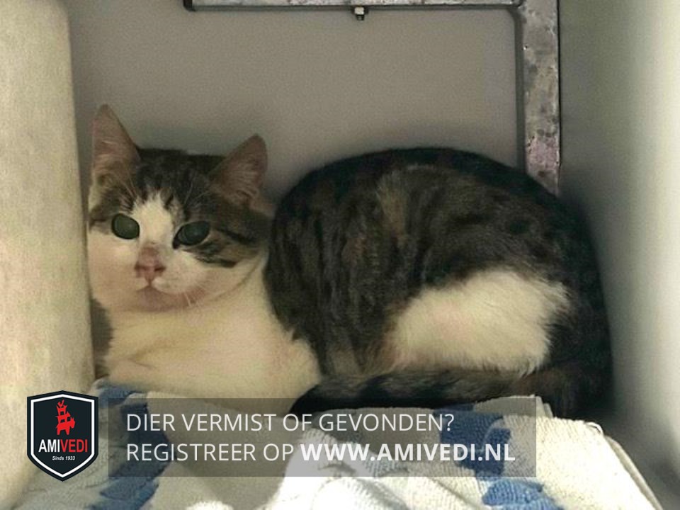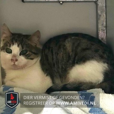 | Signalement | Jonge cypers grijs zwart gestreept met witte ongecastreerde kater Witte snoet over rechter oog naar de rechter wang en de snoet, witte kin, witte borst, witte voorpoten, witte buik, witte achterpoten. |