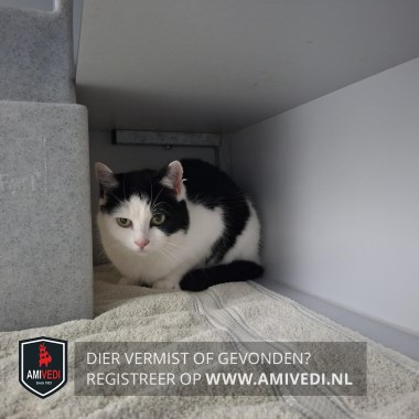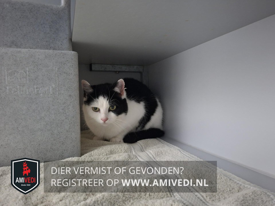 | Signalement | Mogelijk zwart witte poes in linker oor een scheur. Half zwarte oortjes, zwart loopt op de kop af over linker oog en linker wang. Witte snoet over rechter oog en wang, witte kin, witte borst, witte voorpoten, witte buik, witte achterpoten. |