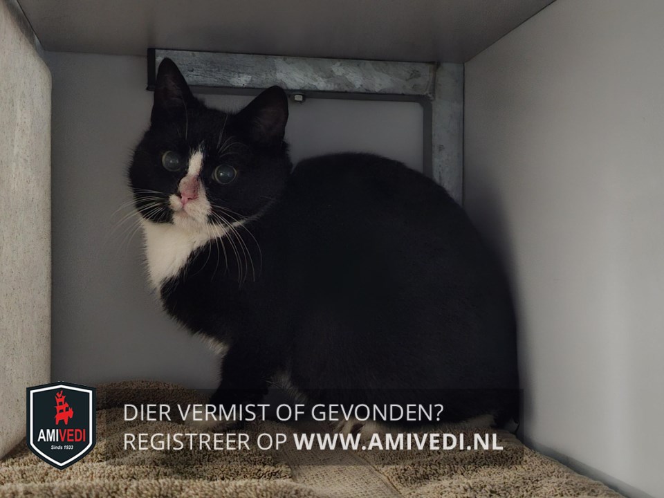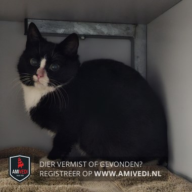 | Signalement | Vermoedelijk jonge poes, zwart wit Witte neusbrug uigelopen in een oneven witte witte snor onder de neus met een grotere witte snor links, wit kinnetej, witte borst, witte voetjes voor, witte sokjes achter met tussen de buitenste teen en eenalaatste teen op het voetje links achter een zwarte vlek. |