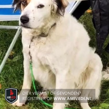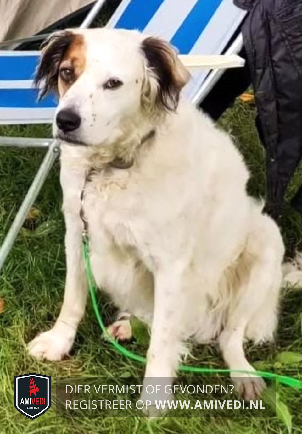 | Signalement | Wit met bruin. Voornamelijk wit, bruine ogen, donkere hangende oortjes, rond rechteroog bruin, enkele donkere spikkeltjes bij linkeroog en op de snuit, zwarte neus. Middelgrote hond. |